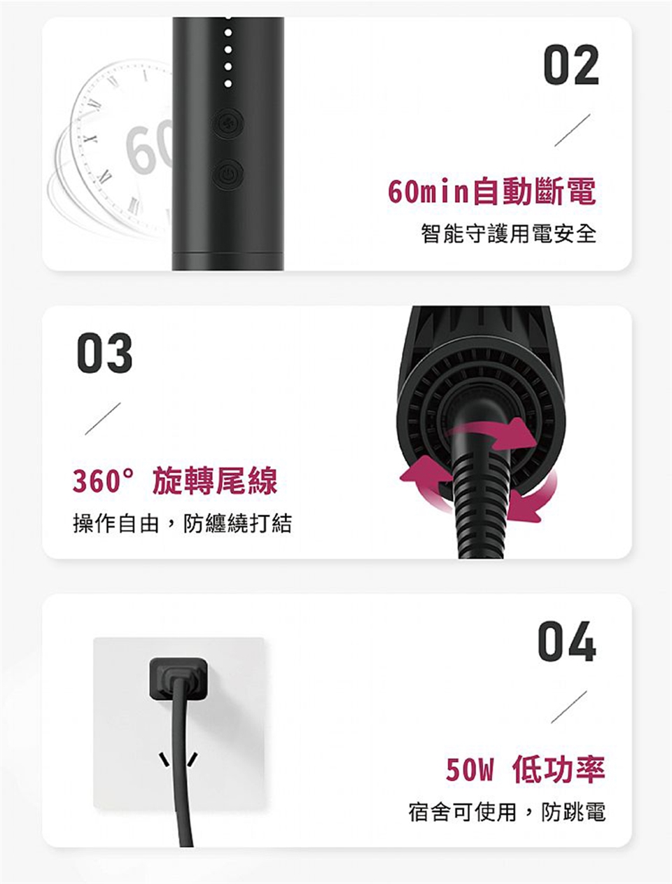 ★「冷風護髮」:快速降溫冷卻塑形,造型更持久,髮絲不易受熱損傷,維持頭髮健康與亮澤度