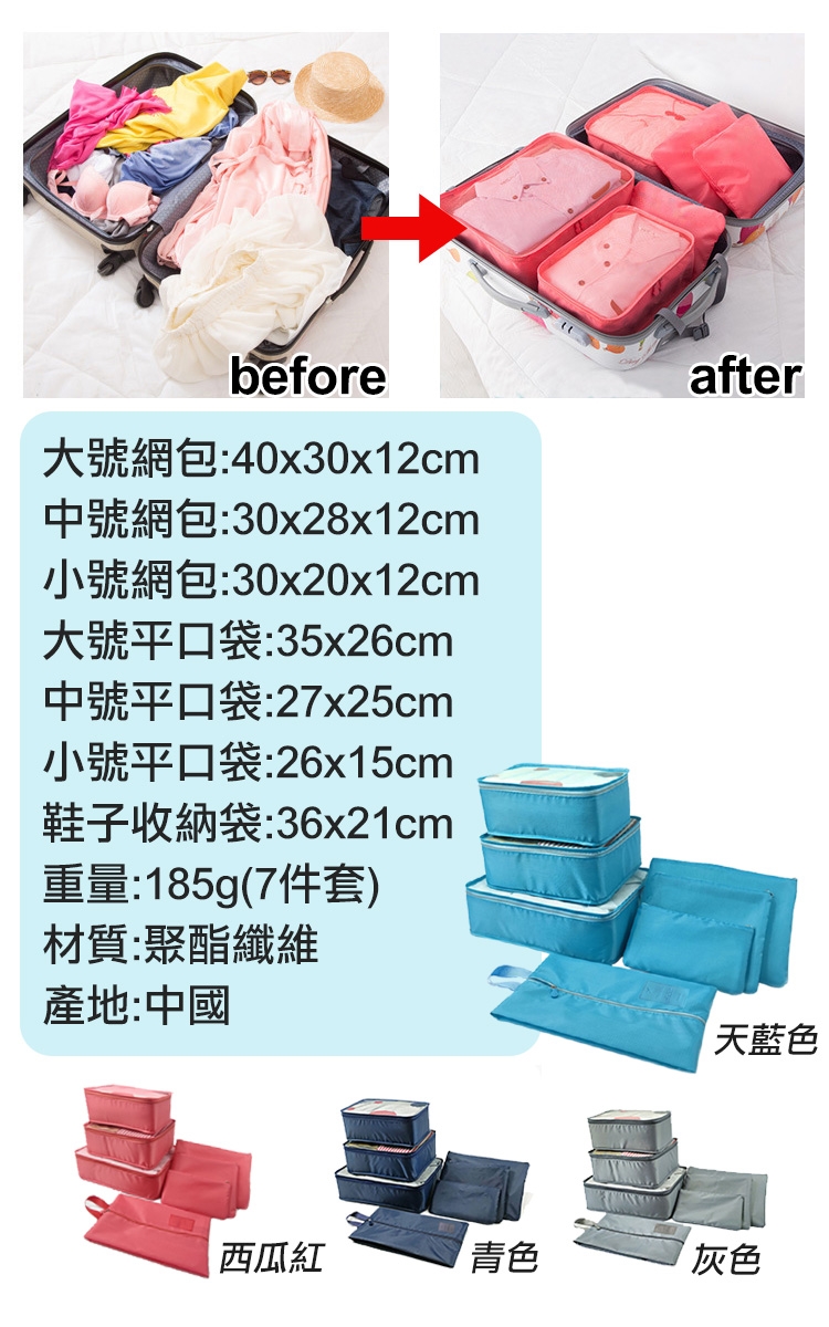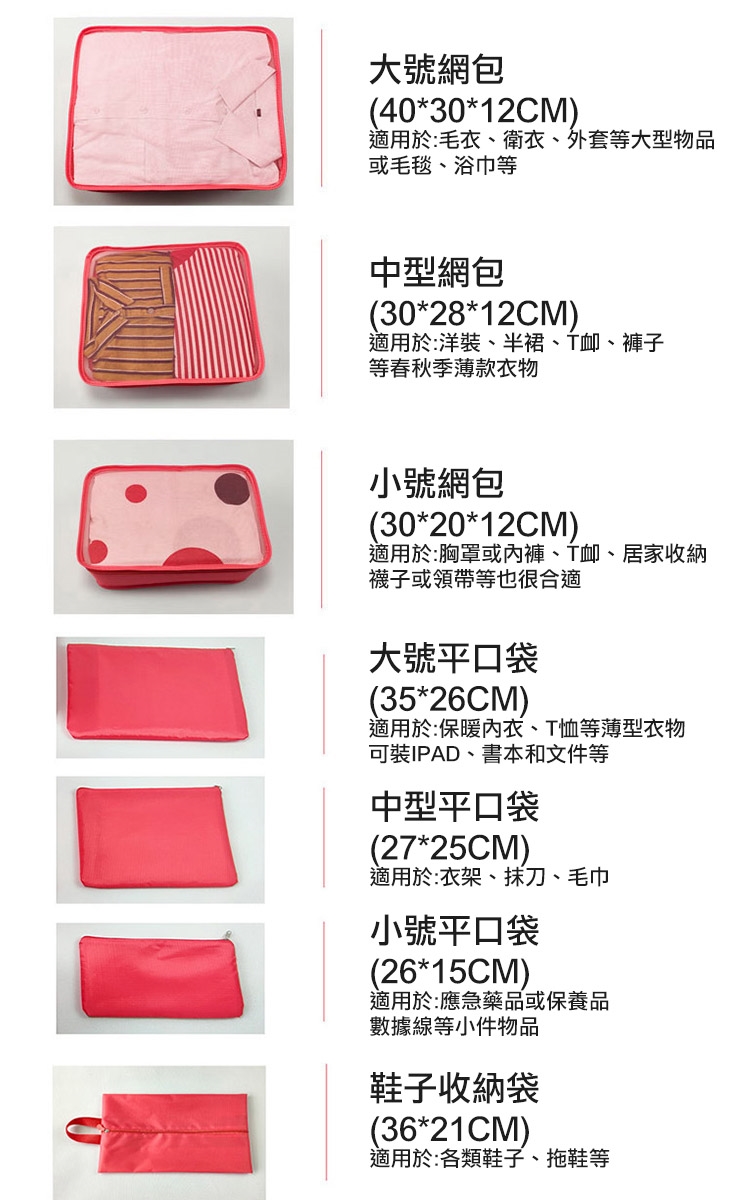商品內容物:大號網包x1、中號網包x1、小號網包x1、大號平口包x1、中號平口包x1、小號平口包x1、鞋子收納袋x1