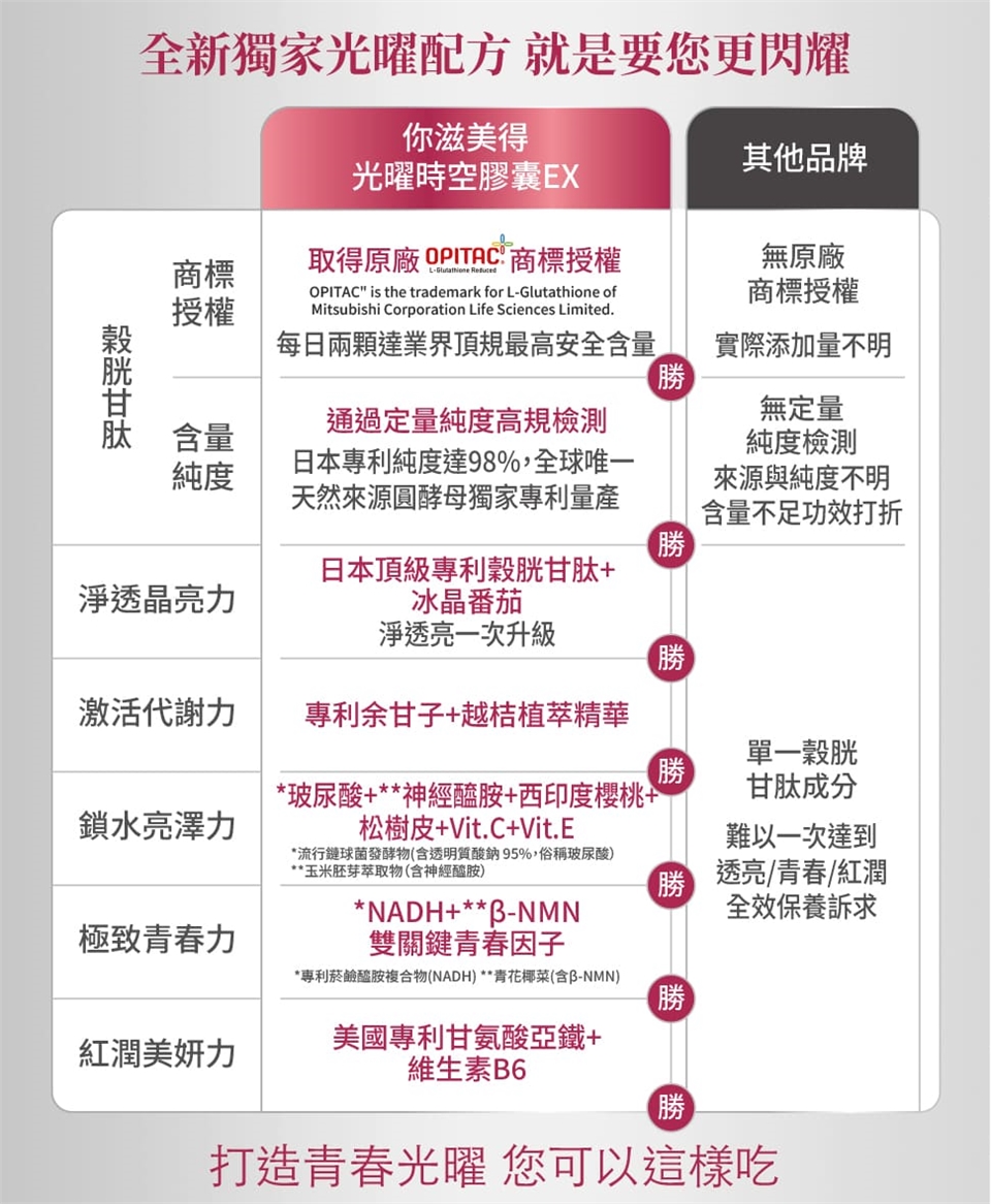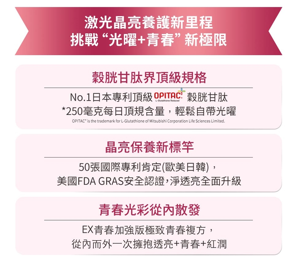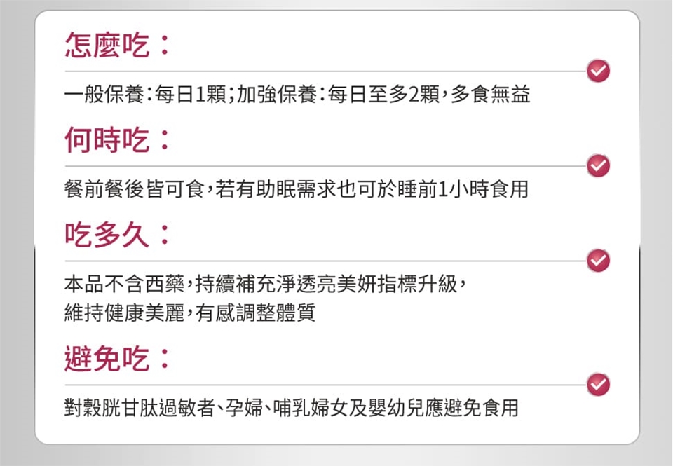 商品詳細介紹 體驗說明 不可體驗 使用方法說明 平日保養:每日1粒;加強保養:每日2粒 ,一日請勿超過2粒,多食無益。請搭配冷溫開水食用,飯前飯後皆可 注意事項 本品含穀胱甘肽,對穀胱甘肽過敏者、孕婦、哺乳婦女及嬰幼兒應避免食用。