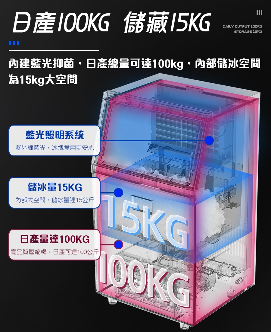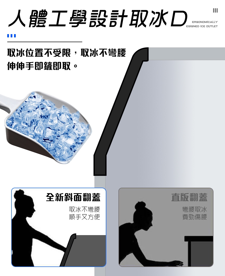 優於市場平均值、外型精巧、日產量達100KG、儲冰倉高達15KG、斜面翻蓋輕鬆取冰不彎腰