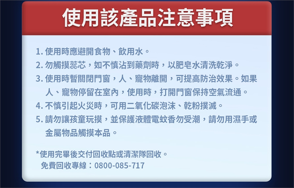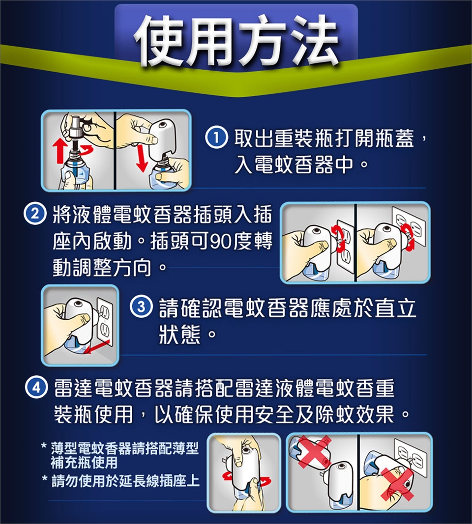 4. 雷達電蚊香器請搭配雷達液體電蚊香重裝瓶使用,以確保使用安全及除蚊效果。(薄型電蚊香器請搭配薄型補充瓶使用)
