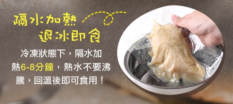 1.產品為冷凍狀態時,隔水加熱6-8分鐘,熱水不要沸騰,回溫後即可食用。