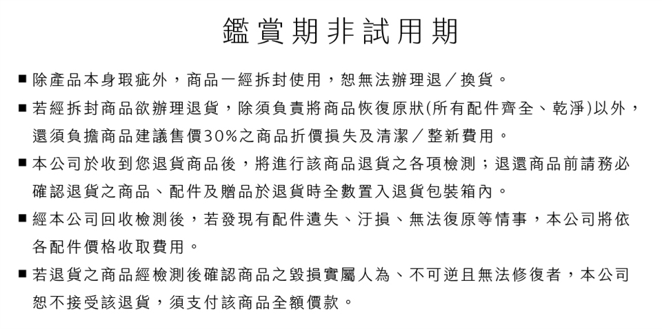 商品到貨享十天猶豫期之權益(注意!鑑賞期非試用期),辦理退貨商品必須是全新狀態且包裝完整,否則將會影響退貨權限。各類商品退換貨限制說明