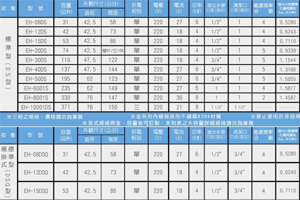 ●電熱水器分別為儲熱型、瞬熱型