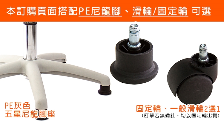 本款有兩種輪組可選,訂購前請注意,左圖為PP固定輪(不會滑動,輪子為平面),右圖為一般PP滑輪(可推動,學齡孩童為了安全,建議選擇固定輪,避免孩童上下椅子時,椅子滑動造成摔倒。