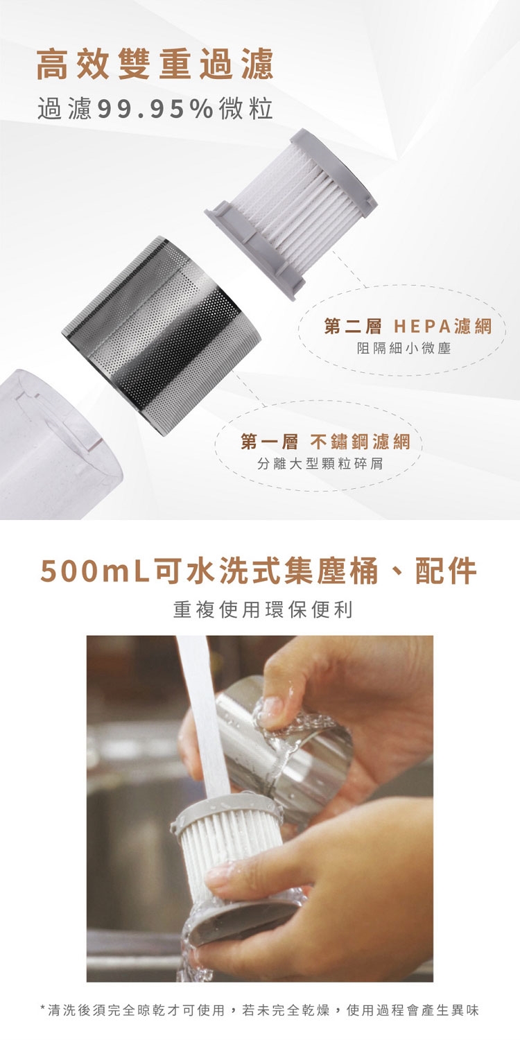 ◆ 不鏽鋼濾網+HEPA濾心多重過濾更潔淨,可水洗重覆使用