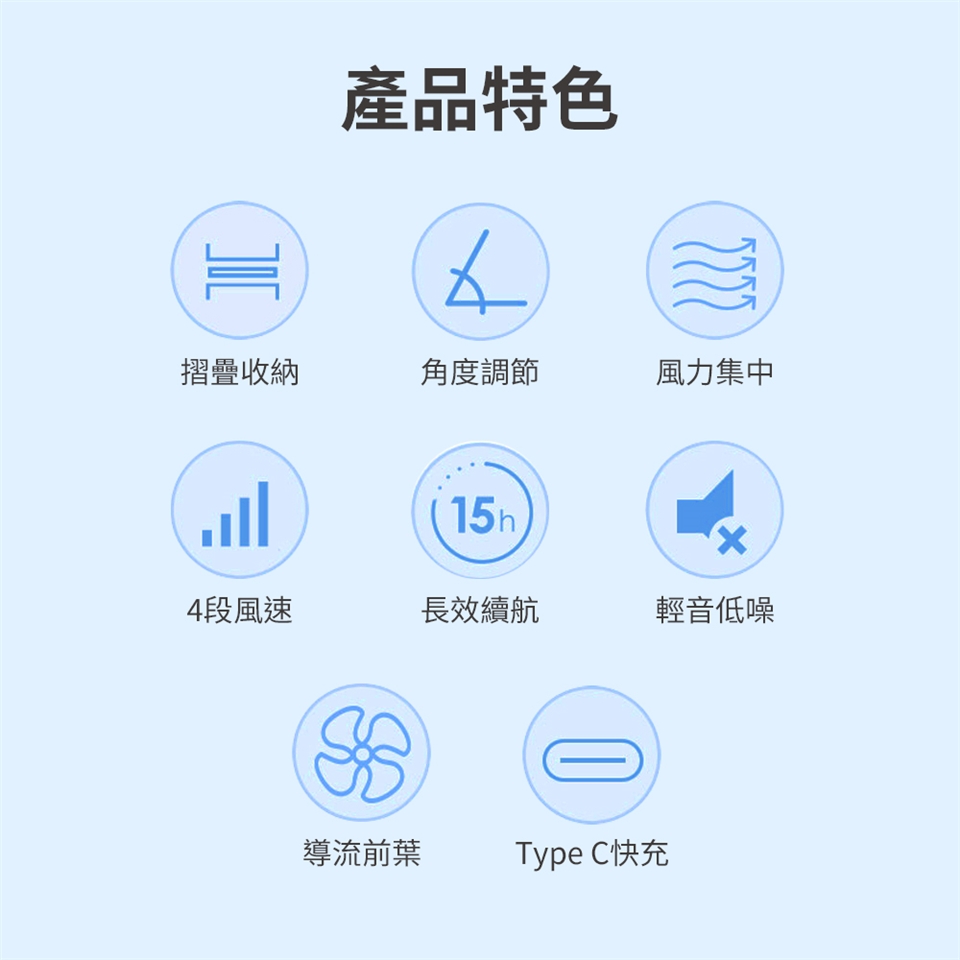 扇葉180度,支桿65度,各角度輕鬆調節
