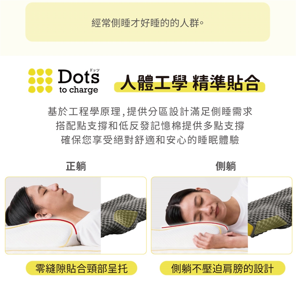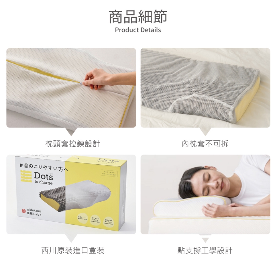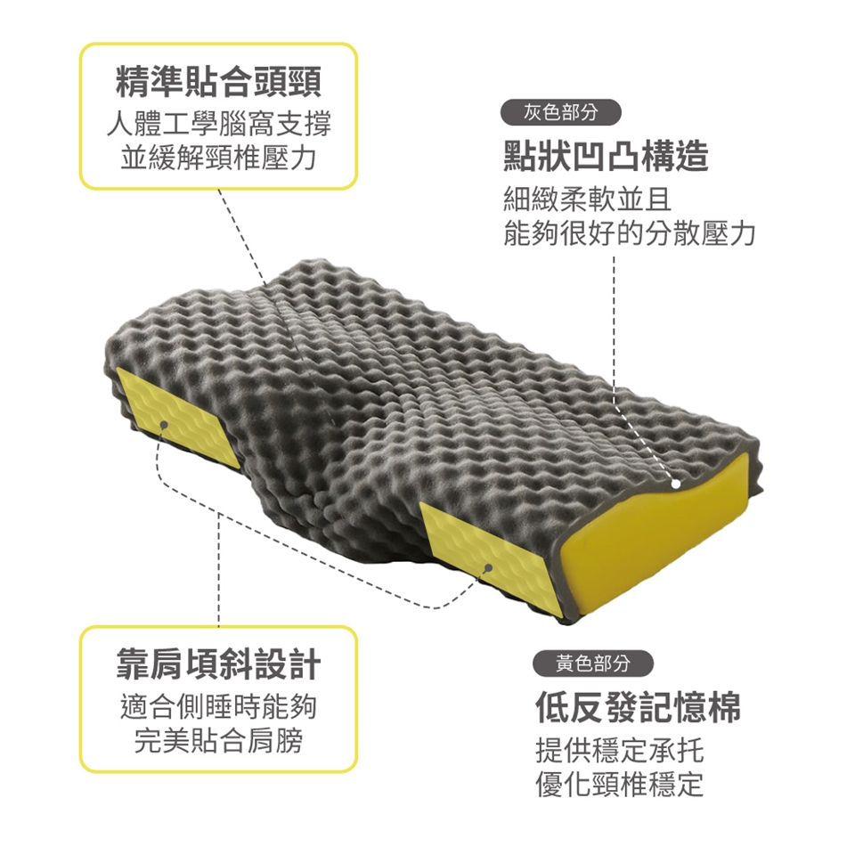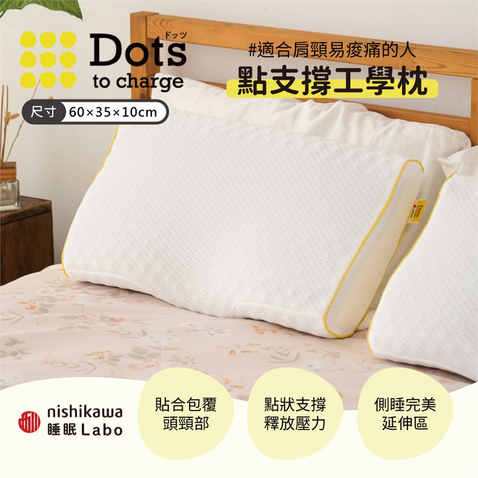- nishikawa 睡眠Labo 點支撐工學枕適合肩頸易痠痛的人,透過點狀凹凸構造和低反發記憶棉讓頭部枕上去後能夠有效分散頭部壓力。基於工程學原理,提供分區設計滿足側睡需求搭配點支撐和低反發記憶棉提供多點支撐,確保您享受絕對舒適和安心的睡眠體驗。