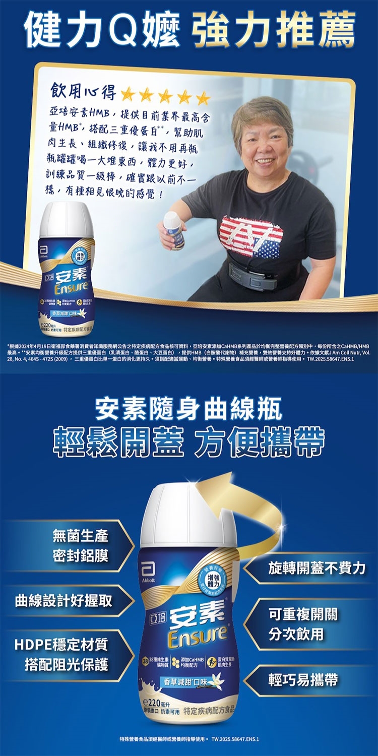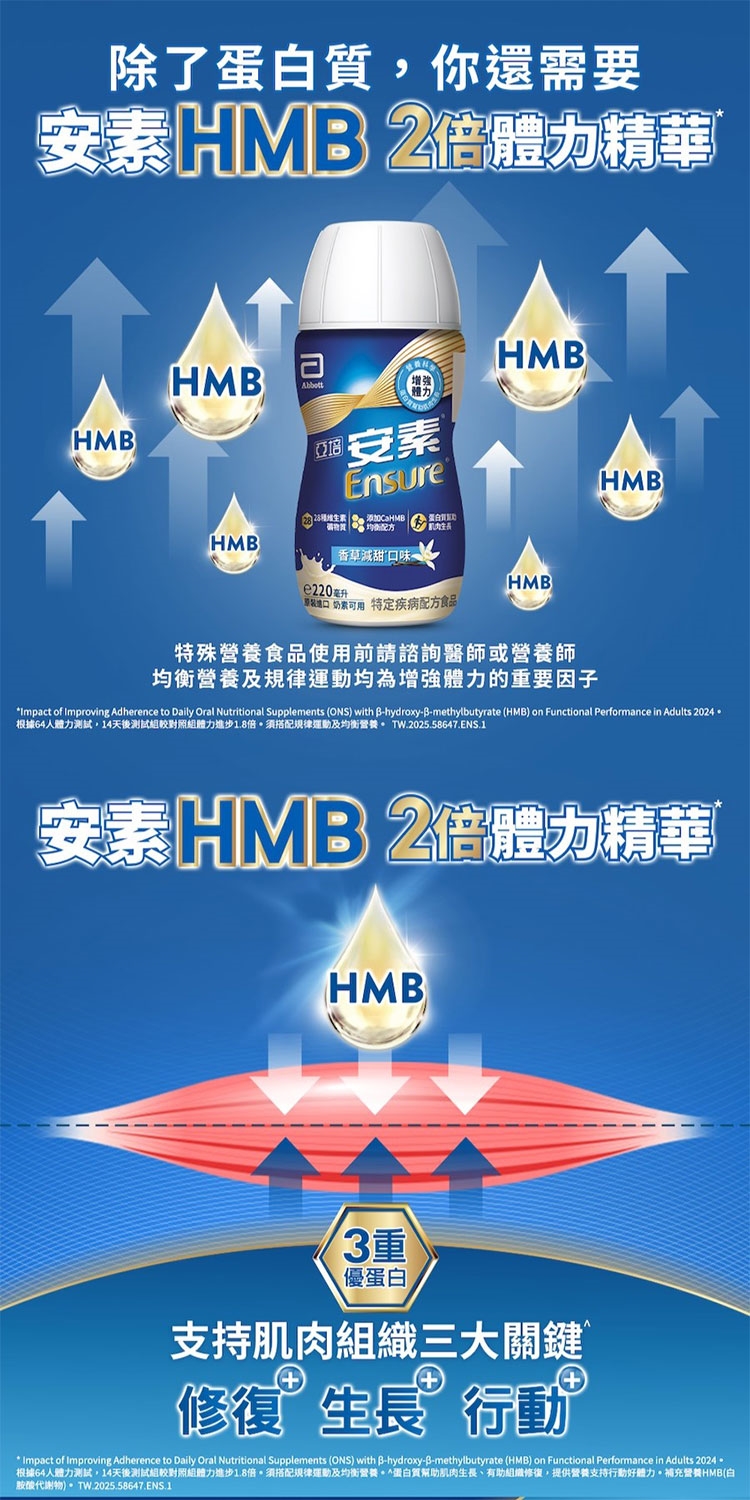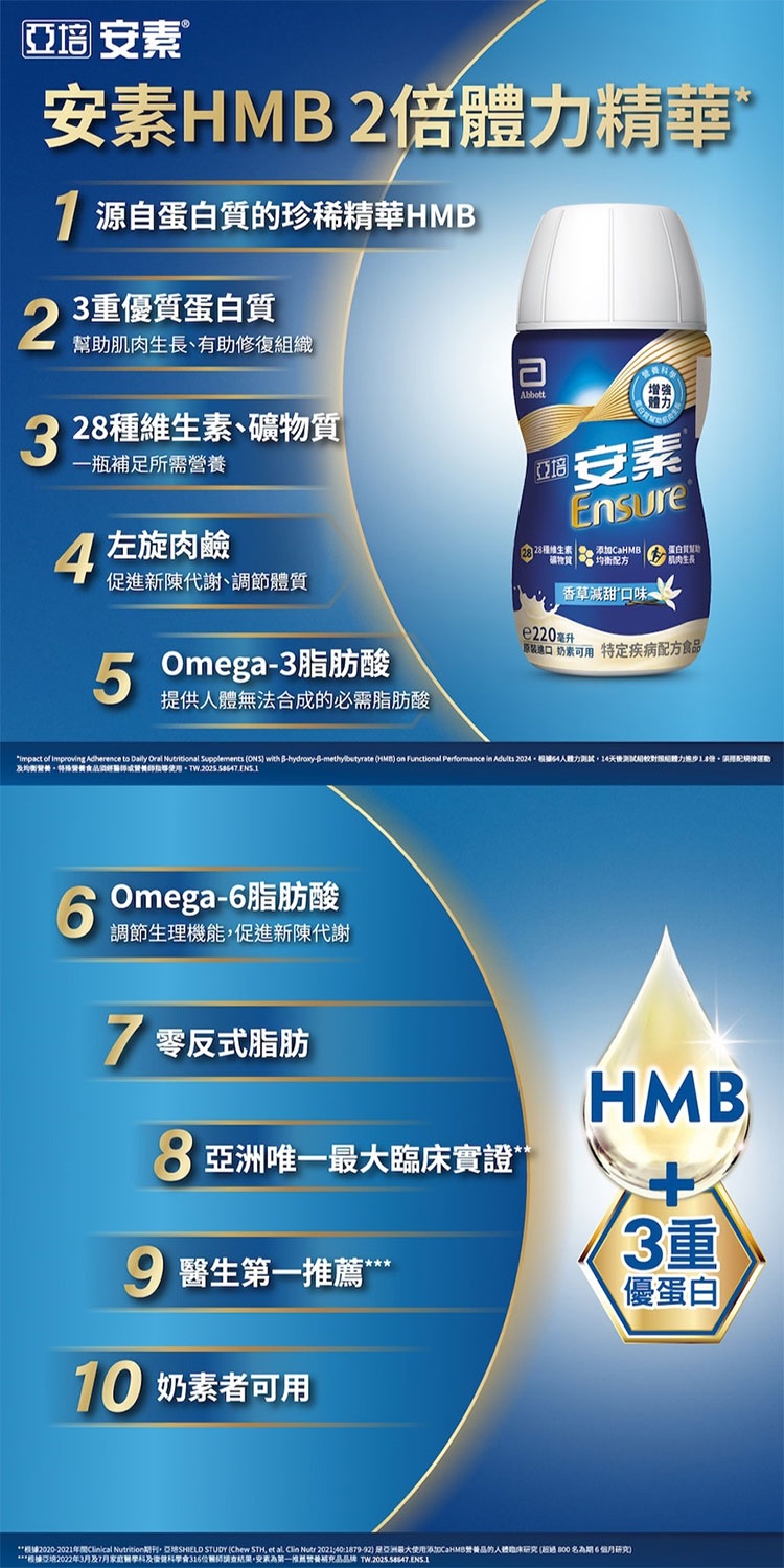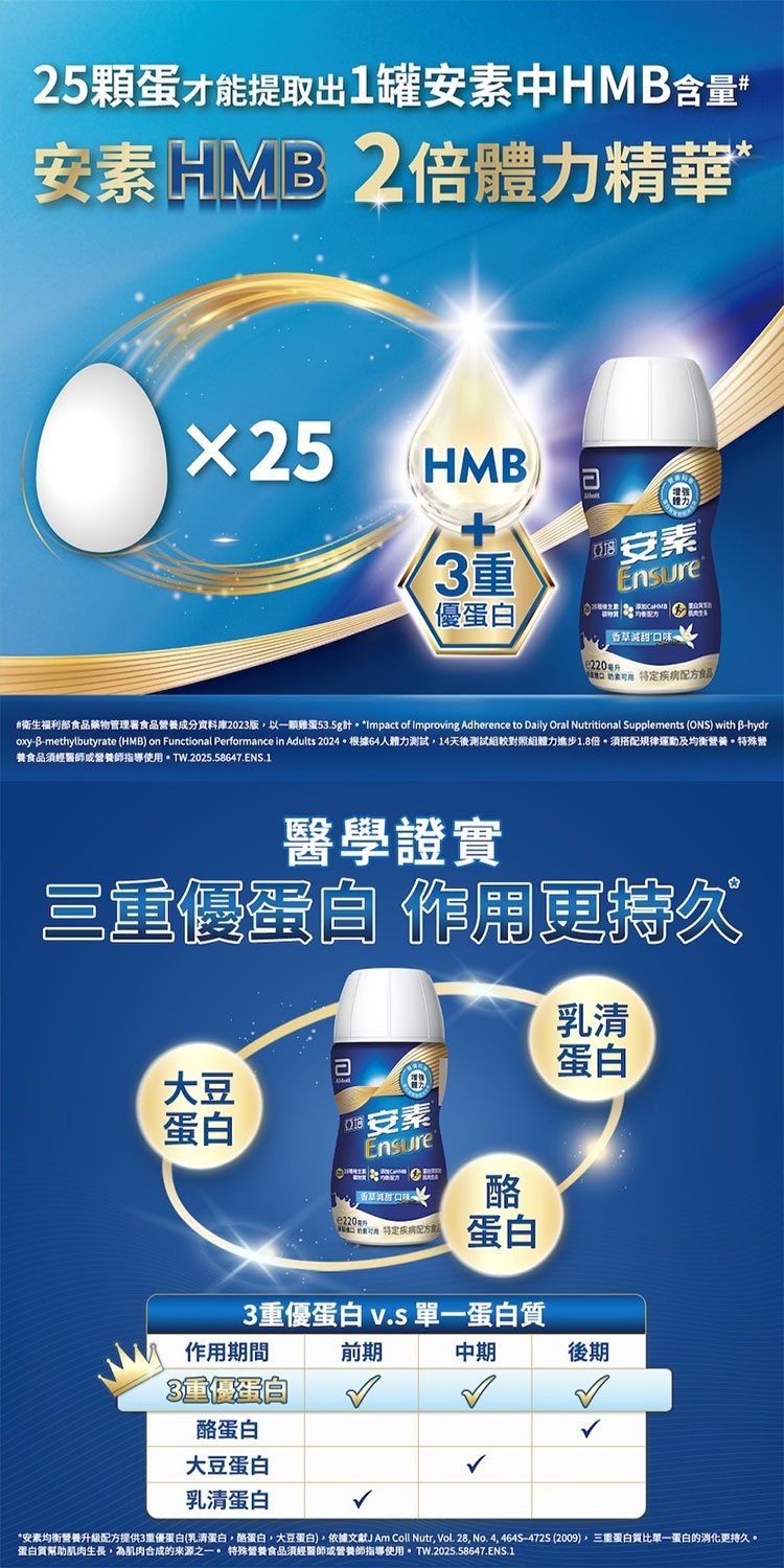 ◆ 亞培安素升級配方添加CaHMB,以先進營養科學為基礎,可提供均衡營養以及必需營養素,符合衛福部每日飲食建議之三大營養素比例(熱量%)。