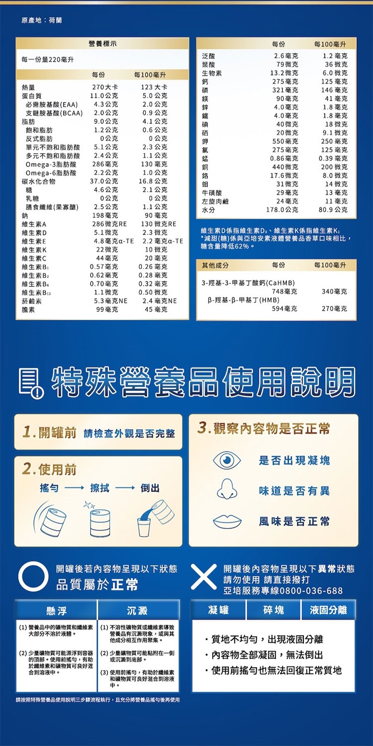 | 其他揭露事項 | 注意事項 本品屬特定疾病配方食品,不適合一般人食用,須經醫師或營養師指導使用,作為唯一營養來源時,每日飲用1500大卡,可取代正餐,或作為二餐間使用之部分營養補充之口飲或管灌食品。非經專業人員指導,不建議給孩童,不適宜孕婦及未滿18歲者食用。半乳糖血症者不適用。請勿由靜脈注射。食用過量無助於疾病改善。本產品含有牛奶、大豆及其製品。本產品零乳糖。營養宣稱以100毫升為衡量基準。 保存條件 未開瓶前可存放在乾燥陰涼處,開瓶後請儘速使用,開瓶後未馬上使用的部分請加蓋冷藏,並在24小時內用完。 |