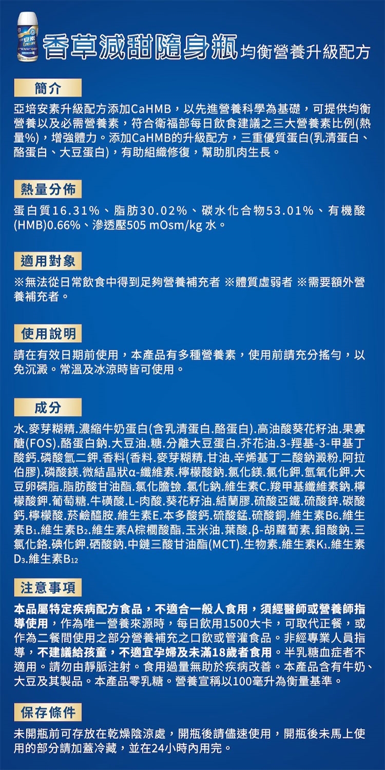 | 內容物成份 | 水.麥芽糊精.濃縮牛奶蛋白(含乳清蛋白.酪蛋白).高油酸葵花籽油.果寡醣(FOS).酪蛋白鈉.大豆油.糖.分離大豆蛋白.芥花油.3-羥基-3-甲基丁酸鈣.磷酸氫二鉀.香料(香料.麥芽糊精.甘油.辛烯基丁二酸鈉澱粉.阿拉伯膠).磷酸鎂.微結晶狀α-纖維素.檸檬酸鈉.氯化鎂.氯化鉀.氫氧化鉀.大豆卵磷脂.脂肪酸甘油酯.氯化膽生僉.氯化鈉.維生素C.羧甲基纖維素鈉.檸檬酸鉀.葡萄糖.牛磺酸.L-肉酸.葵花籽油.結蘭膠.硫酸亞鐵.硫酸鋅.碳酸鈣.檸檬酸.菸鹼醯胺.維生素E.本多酸鈣.硫酸錳.硫酸銅.維生素B6.維生素B1.維生素B2.維生素A棕櫚酸酯.玉米油.葉酸.β-胡蘿蔔素.鉬酸鈉.三氯化鉻.碘化鉀.硒酸鈉.中鏈三酸甘油酯(MCT).生物素.維生素K1.維生素D3.維生素B12 |