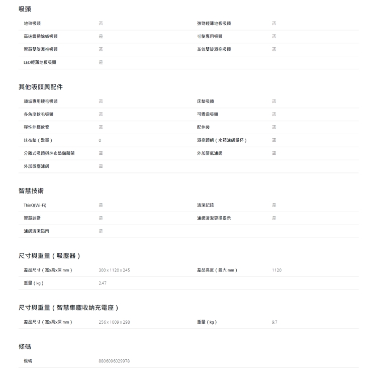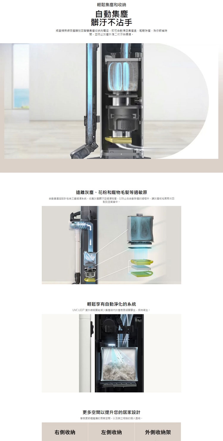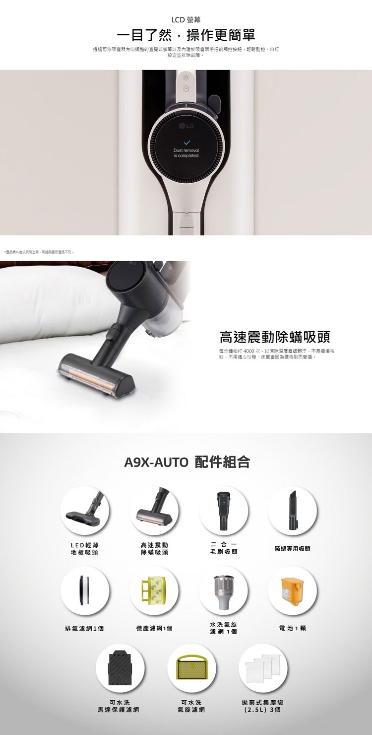 ◎ 專屬配件:LED輕薄地板吸頭、高速震動除螨吸頭、二合一毛刷吸頭、隙縫專用吸頭、電池、微塵濾網、HEPA排氣濾網、水洗氣旋濾網、2.5L拋棄式集塵袋×3、可水洗馬達保護濾網、可水洗氣旋濾網