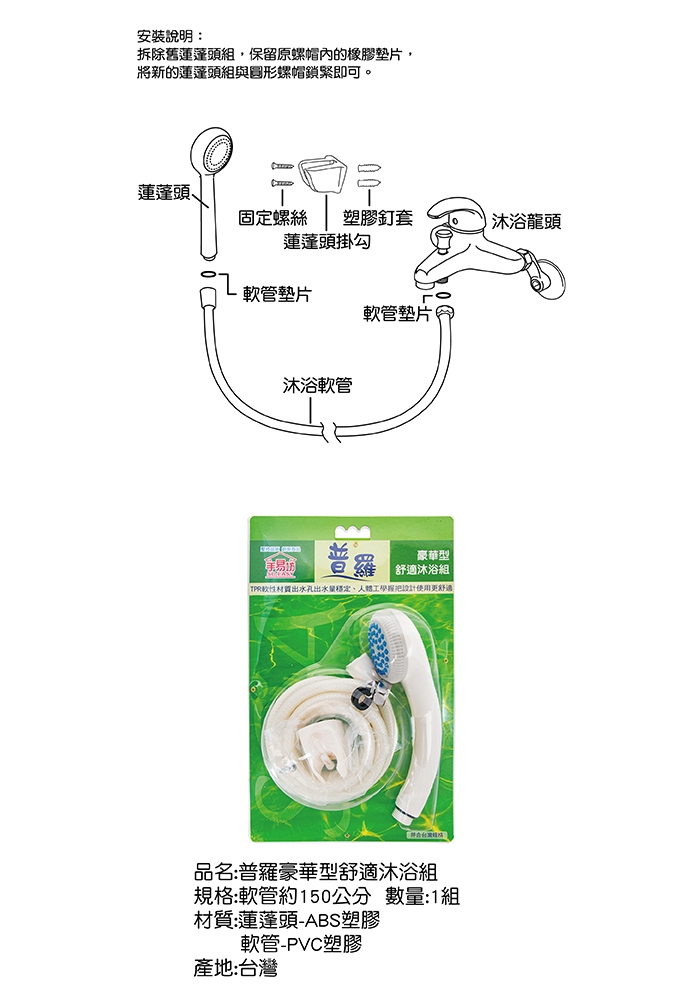 ◎ 單段蓮蓬頭把手x1 / 150cmPVC軟管x1 / 蓮蓬頭固定座x1