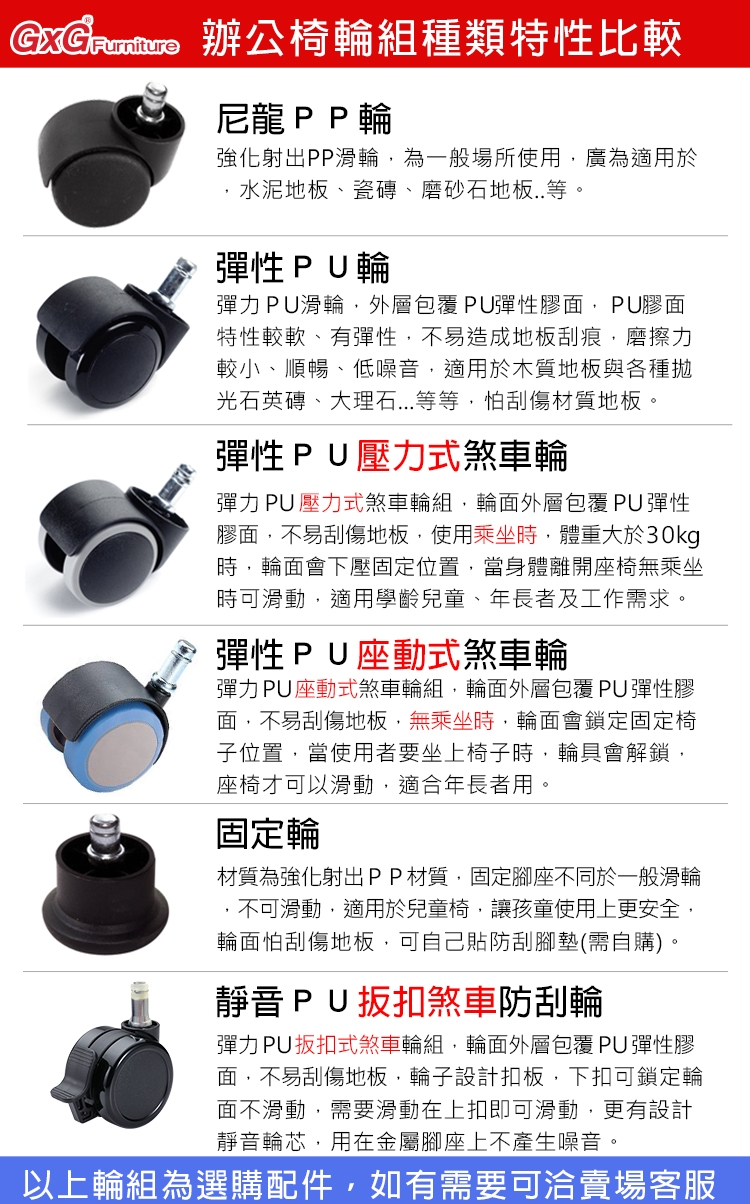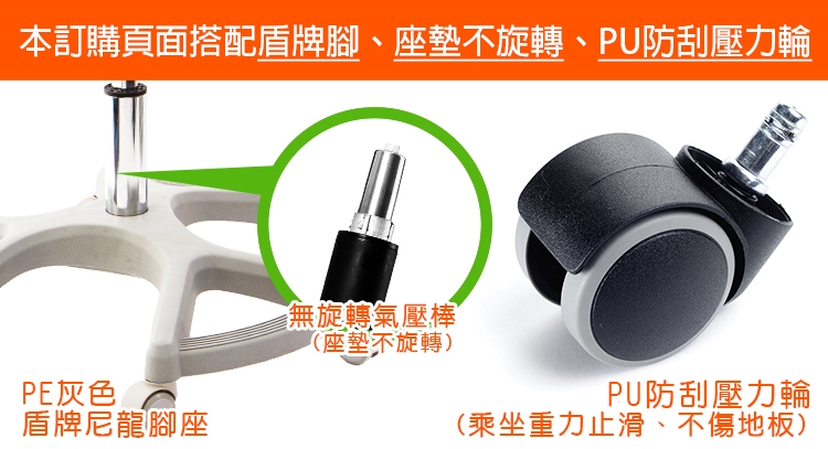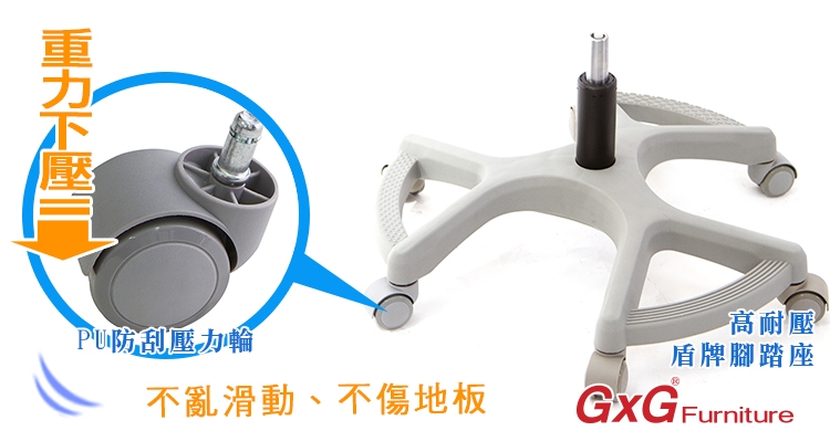 本款使用『PU壓力輪』:椅子在乘坐時,輪子會因重量下壓,止滑不易滑動;