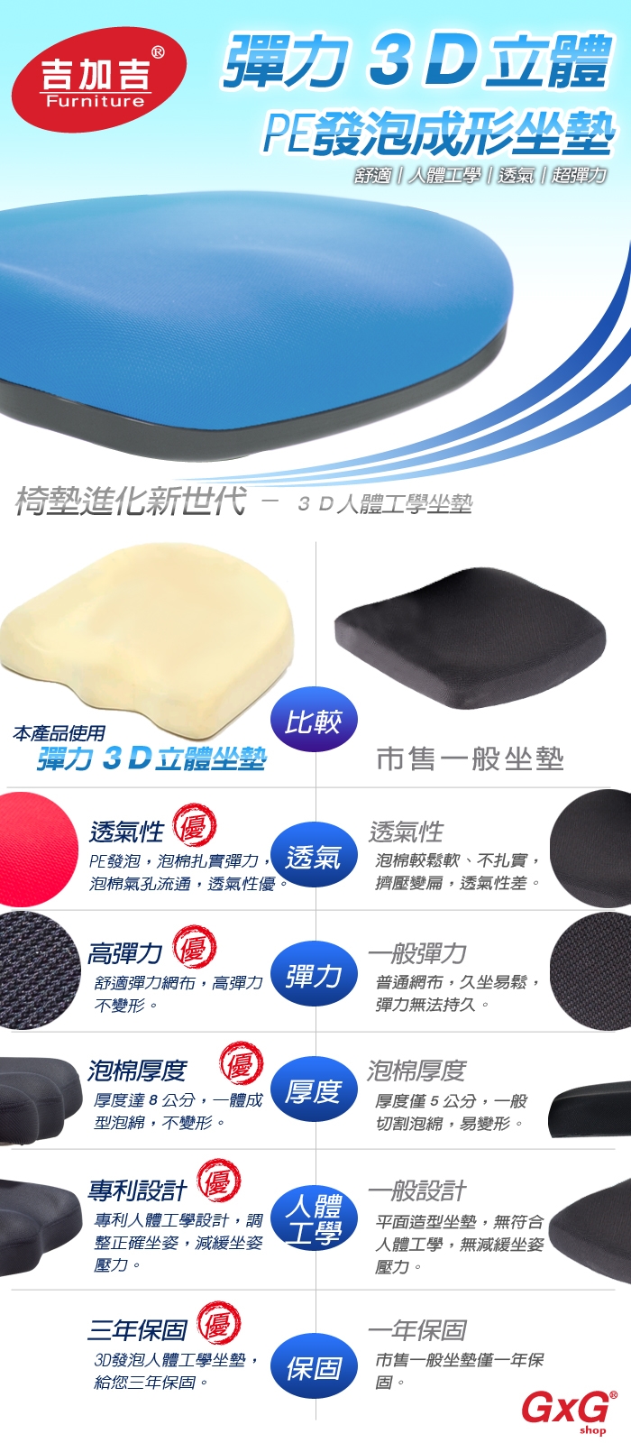 座墊採用『成型發泡座墊』,採用立體成型,有著完美浪型曲度,讓坐在椅子上時,配合大腿的曲度,不壓迫腿部,讓血液能良好的循環,有效防止胖胖腿、靜脈曲張等文明病,成型泡棉多用於運動、醫療器材上,彈力感極佳,座墊使用數年不易塌陷、變形(本款座墊,更享有三年保固),三明治布料包覆椅面,不論是觸感、柔軟度都非常優良!