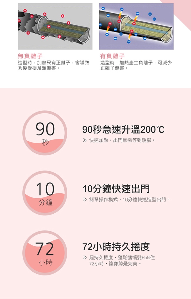 .主動式負離子持續釋放:高濃度負離子主動持續大量釋放,減少秀髮傷害。