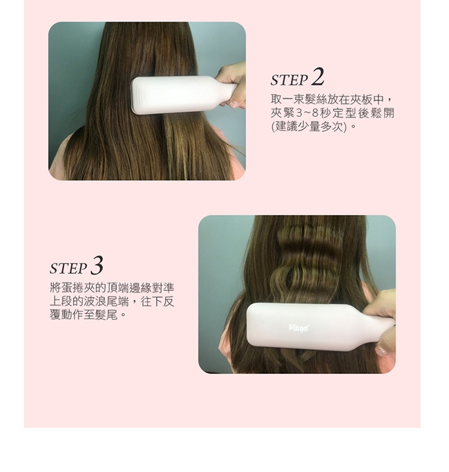 .使用:取適當髮量,用捲髮欲造型部位,壓下3-8秒後,即可放開捲髮夾。