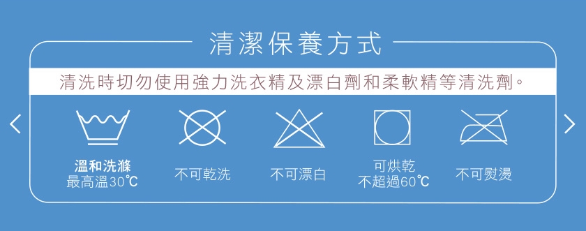 清洗時切勿使用強力洗衣精及漂白劑和柔軟精等清洗劑