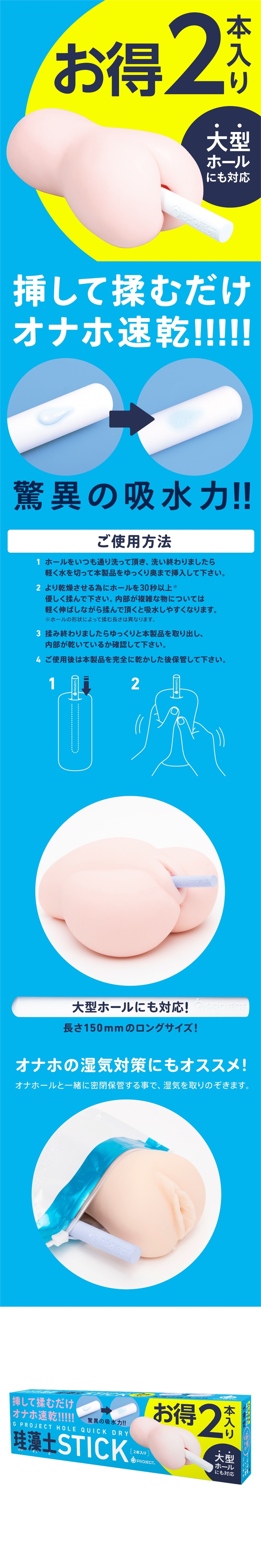 划算的2支裝!超簡單,只需插入自慰套並揉一揉就能馬上乾燥!!!!!『G PROJECT 自慰套速乾珪藻土棒』從插入的瞬間開始棒狀的珪藻土會大量吸收水分達到乾燥!至今為止最深處難以乾燥的大型自慰套都能適用!!請務必體驗驚人的吸水力及速乾力優秀的本產品!※與自慰套一起密封保存可去除濕氣。審查編號:2301989