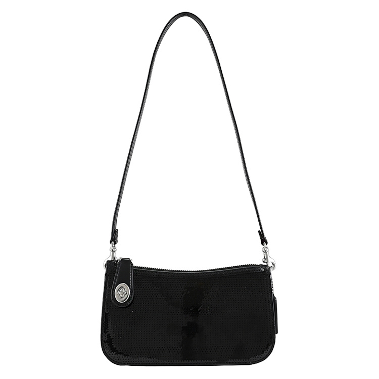 COACH 專櫃商品,與專櫃同步,專櫃單肩包系列,經典轉釦與亮片拼接皮革設計,轉釦+拉鍊開口,附質感皮革吊飾與可拆式肩背帶,可單肩背或手提使用,內可收納中短夾、手機、鑰匙等隨身小物品,整體釋放都會簡約時尚風格,搶眼又好搭的設計風格,兼具典雅時尚氣質。