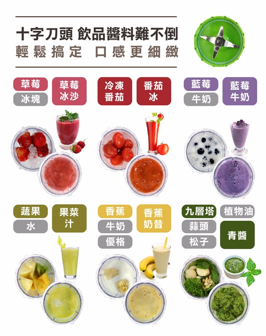 .十字刀頭用來做冰塊搗碎,各式冰鎮飲料,或任何需要切割型的調理。
