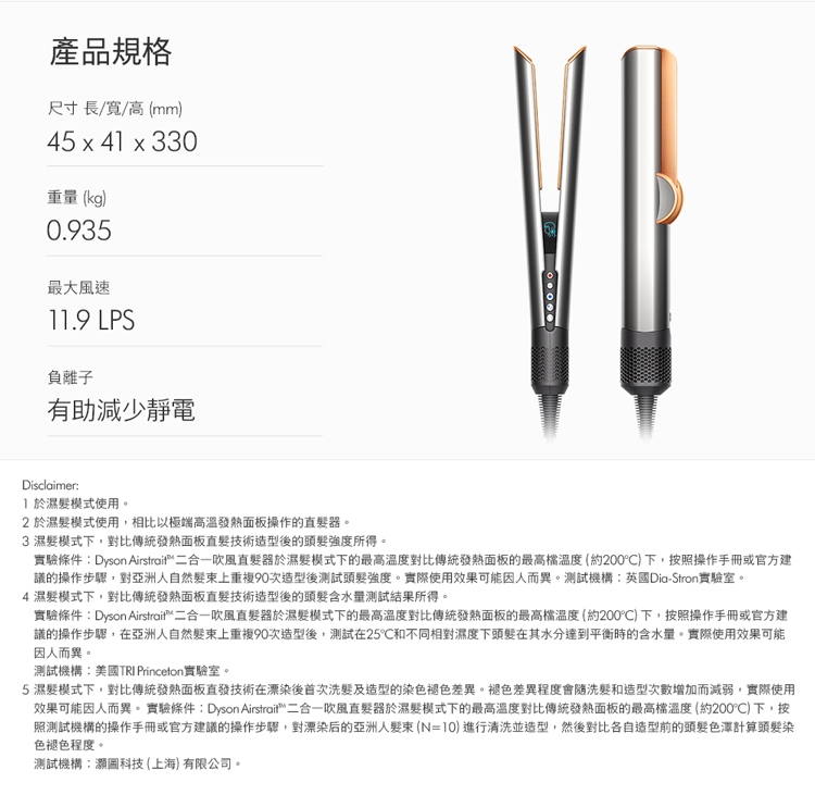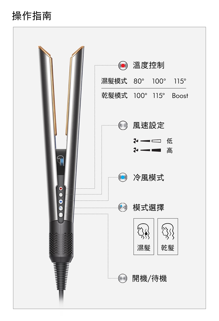 3. 乾濕兩用省時省心:不依賴加熱面板,無熱傷害: 傳統加熱式直髮器,利用高溫造型易造成頭髮斷裂乾枯。Dyson二合一吹風直髮器,提升髮絲強韌度60% / 水潤度28%/ 染髮退色60%