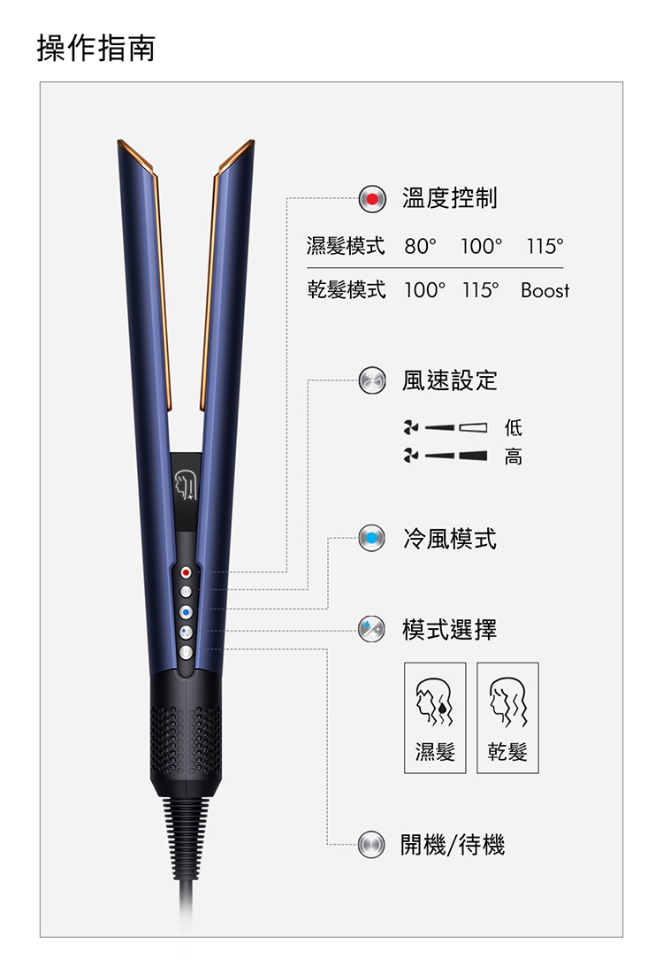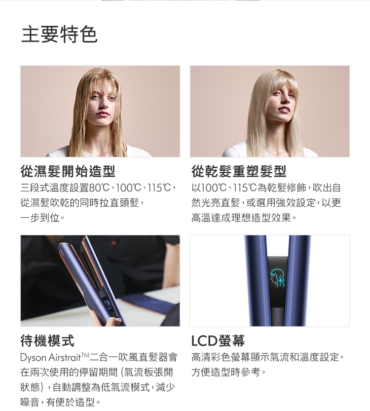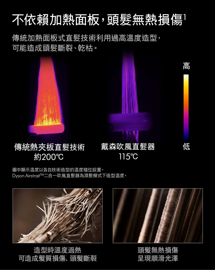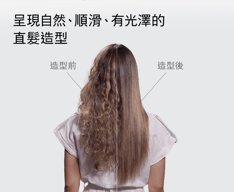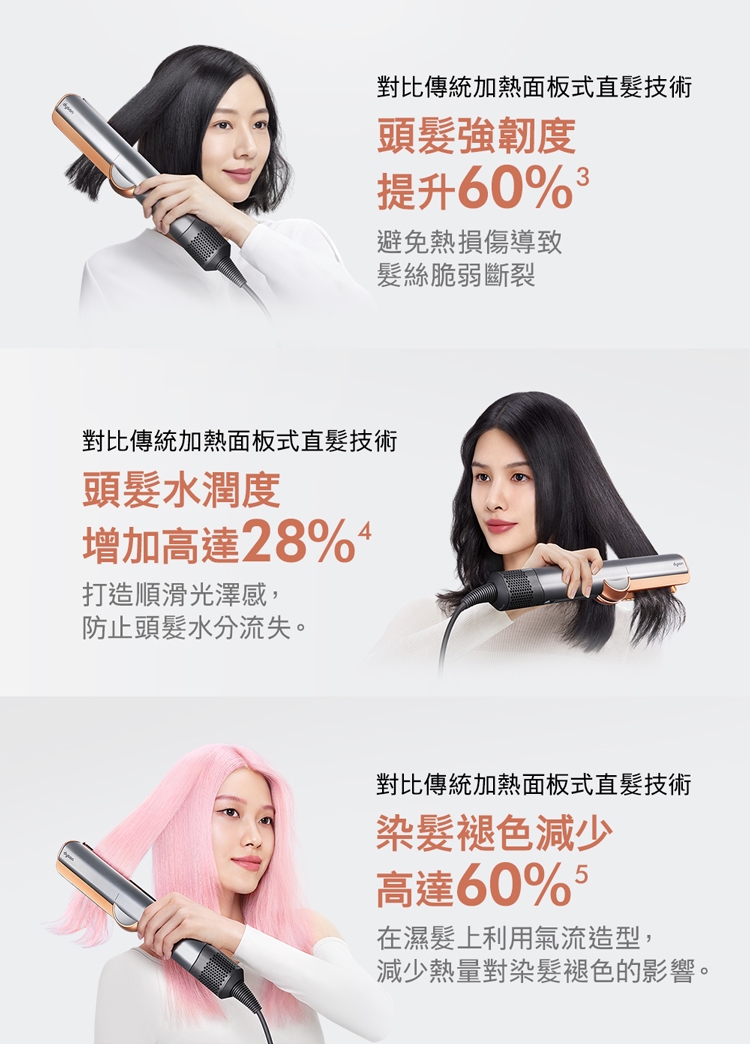 3. 乾濕兩用省時省心:不依賴加熱面板,無熱傷害: 傳統加熱式直髮器,利用高溫造型易造成頭髮斷裂乾枯。Dyson二合一吹風直髮器,提升髮絲強韌度60% / 水潤度28%/ 染髮退色60%