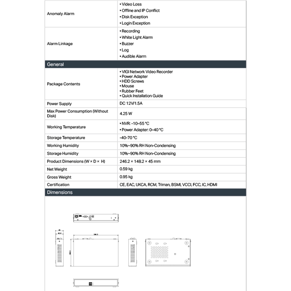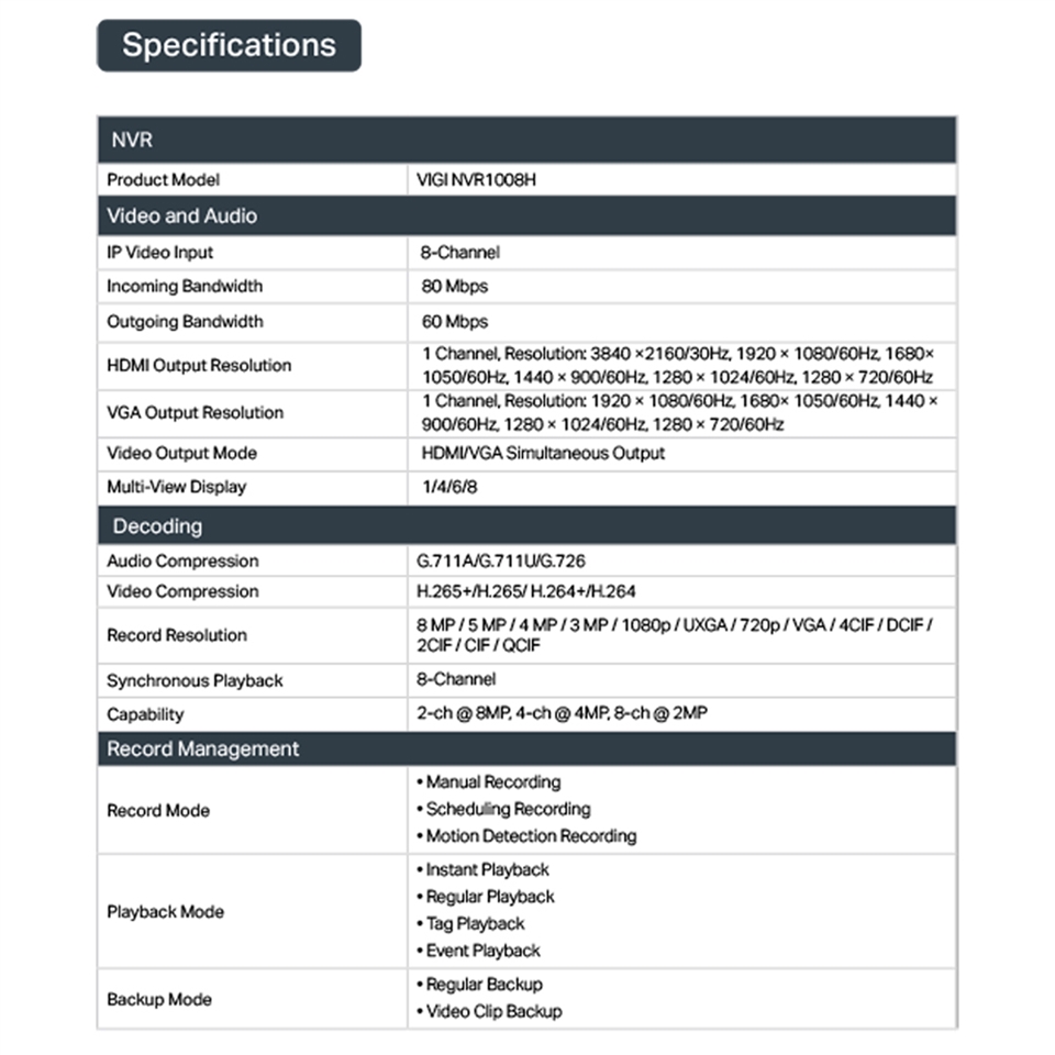 -80 Mbps影片存取頻寬: 高影片存取頻寬確保您的NVR使用高解析度連接更多攝影機。根據實驗室測試,使用 VIGI 攝影機、VIGI NVR 可連接總共最多 8 台 4MP 攝影機。