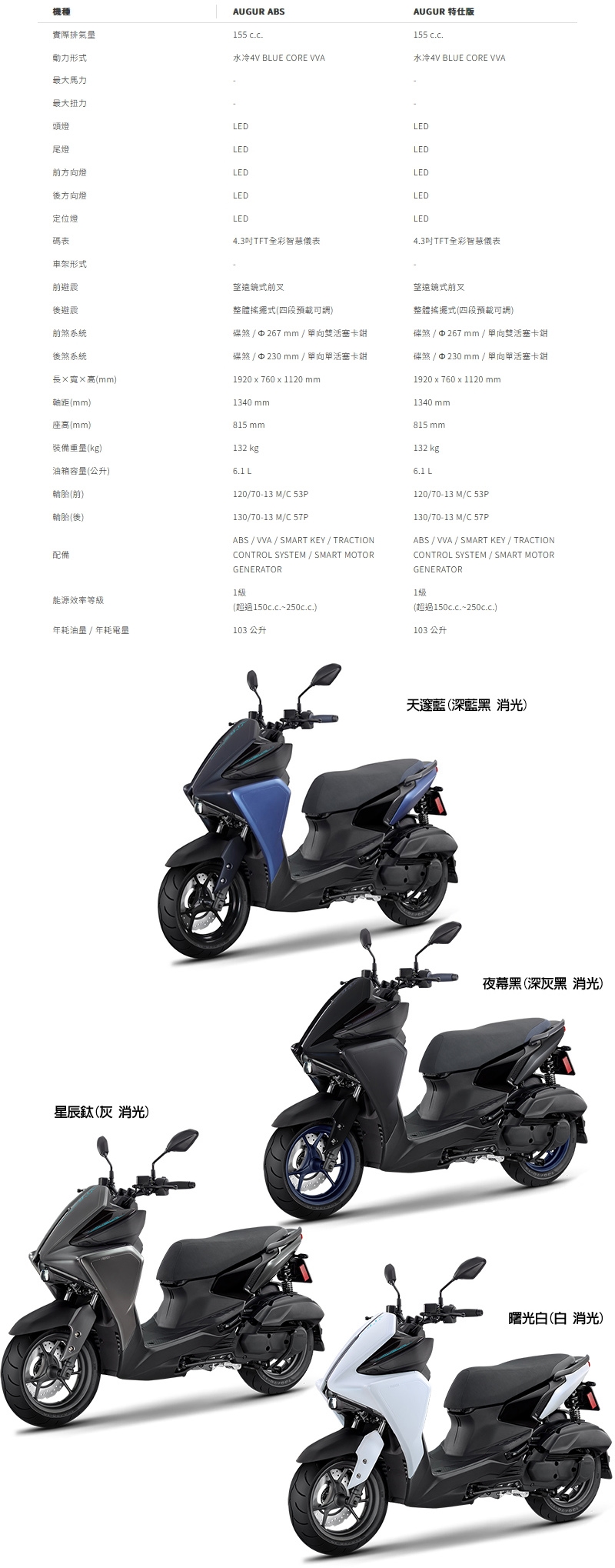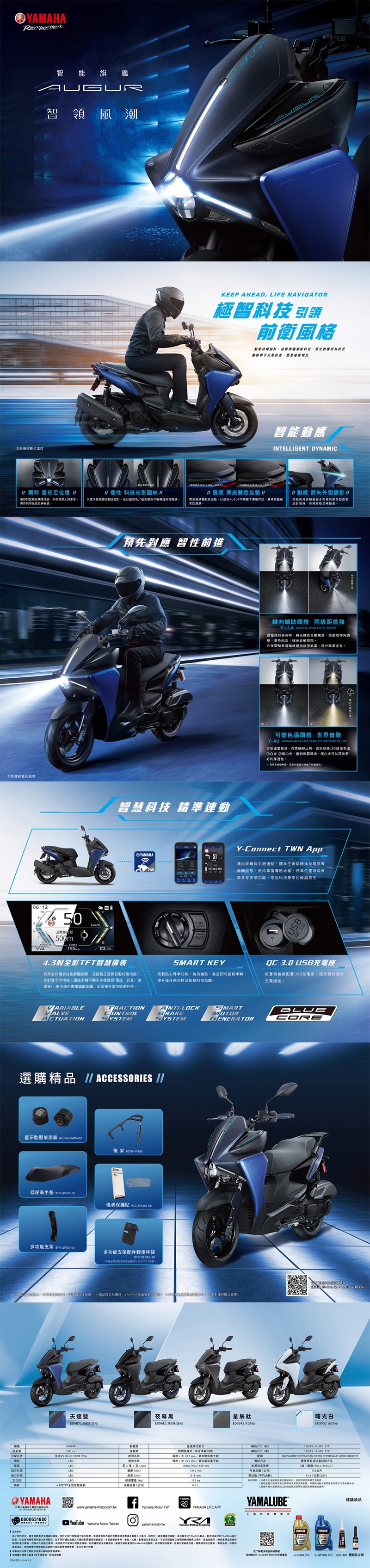 Yamaha 智能旗艦車款「AUGUR」推出全新動感新色,「天邃藍」、「夜幕黑」、「星辰鈦」、「曙光白」4款車色,以全新動感配色,帶領新風潮。
