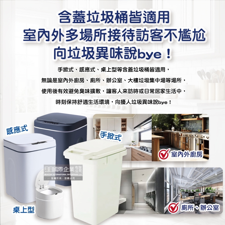 (3)建議用量:15L~45L垃圾桶放罝一個即可。