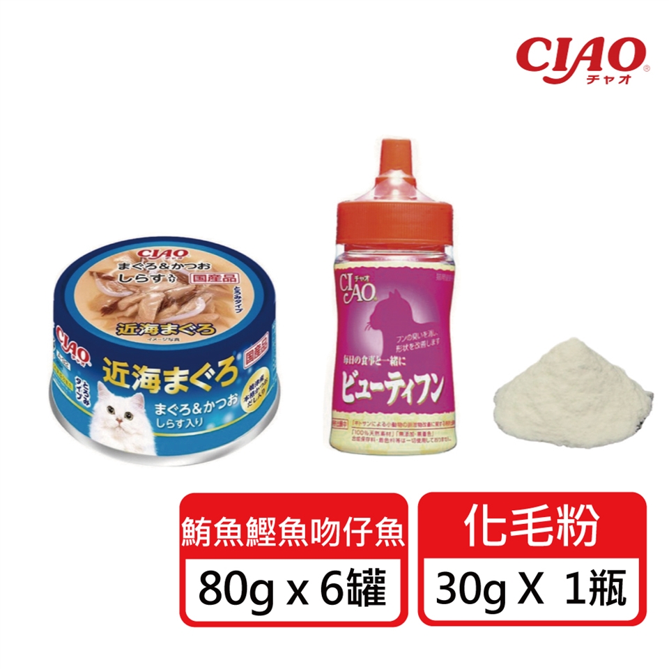 1.近海罐-鮪魚鰹魚吻仔魚 80g x 6罐+化毛粉30g x 1瓶