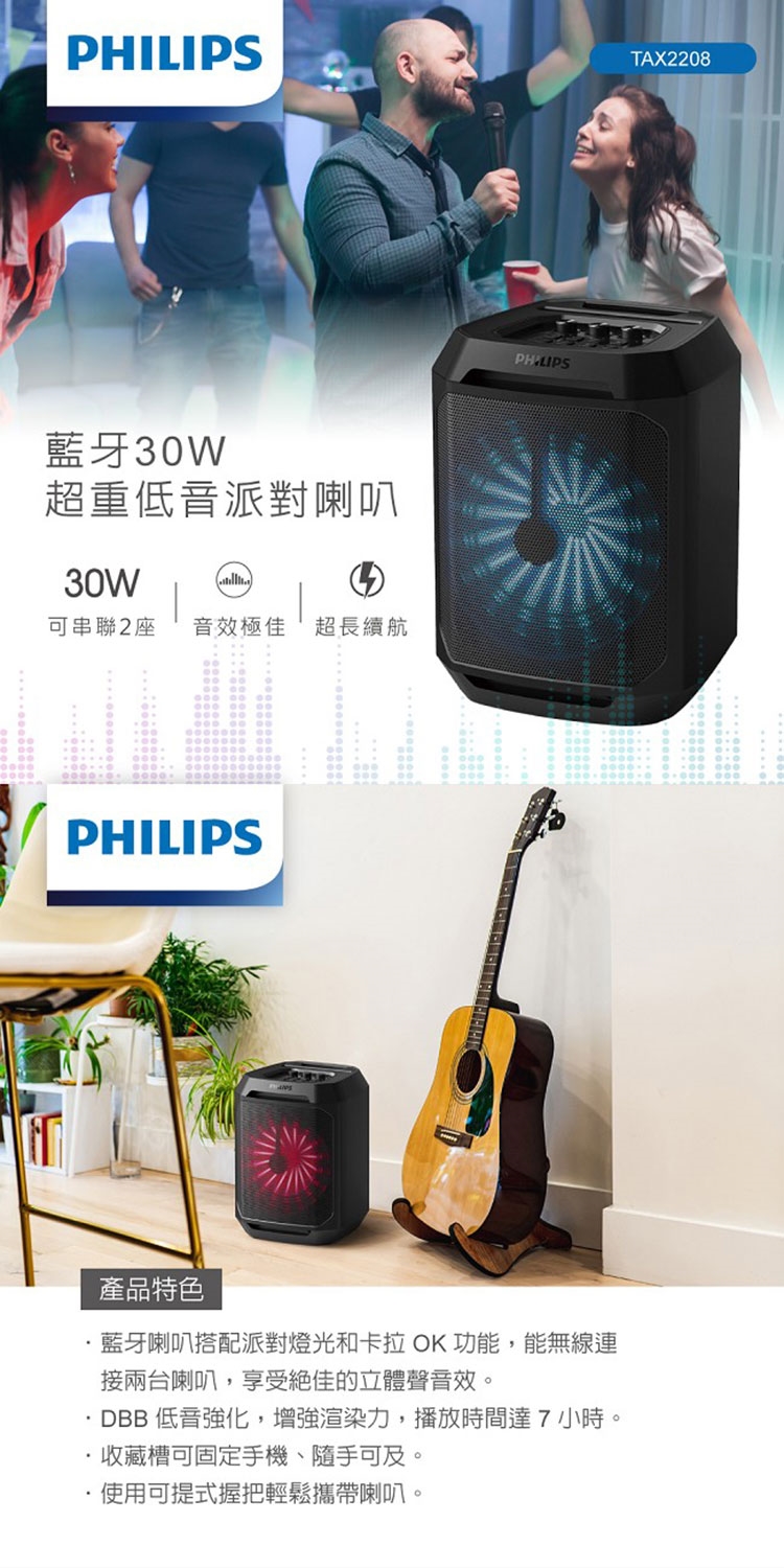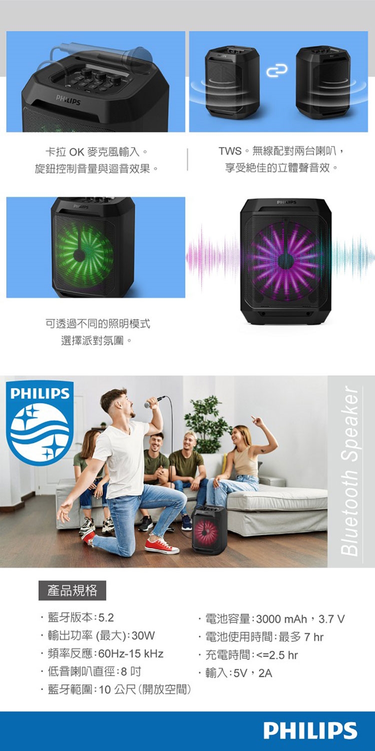 ◆ 藍牙喇叭搭配派對燈光和卡拉 OK 功能,能無線連接兩台喇叭,享受絕佳的立體聲音效