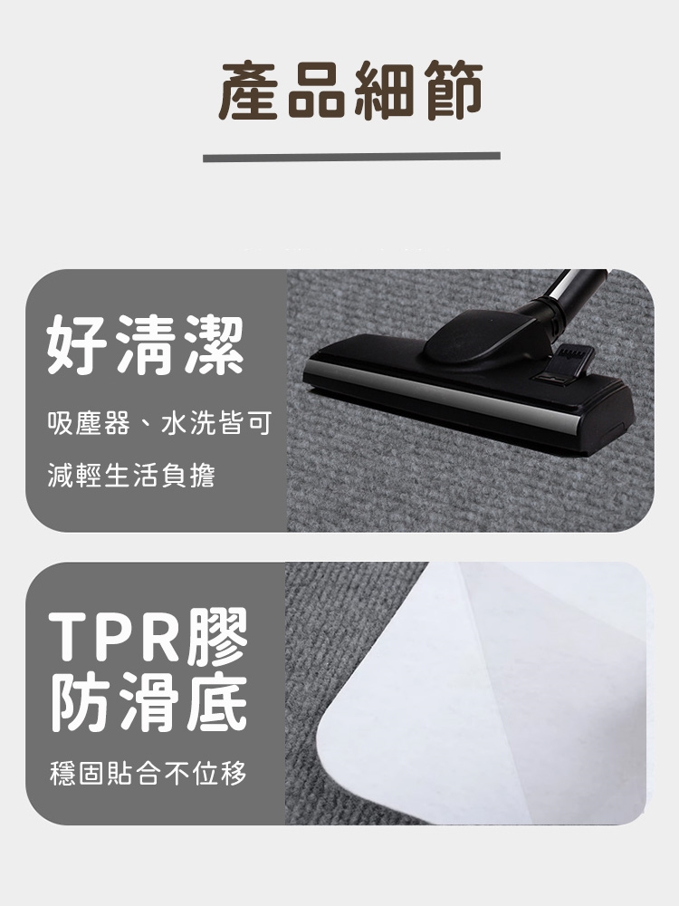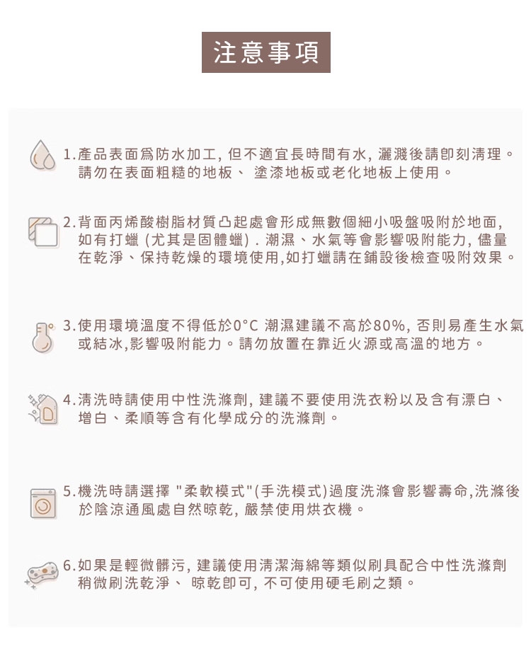 6.背面丙烯酸樹脂材質凸起處會形成無數個細小吸盤吸附於地面,如有打蠟(尤其是固體蠟),潮溼、水氣等會影響吸附能力,儘量在乾淨、保持乾燥的環境使用,如打蠟請在鋪設後檢查吸附效果。