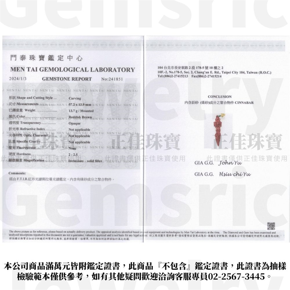 備註:硃砂商品為天然硃砂原礦研磨成粉壓制而成的成品,製作成品過程中均會加入黏著及聚合膠。(特此均有抽樣開立鑑定證書,證明此商品內涵硃砂成分。)