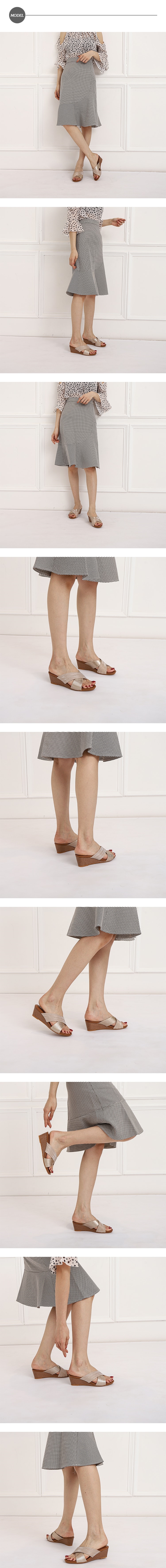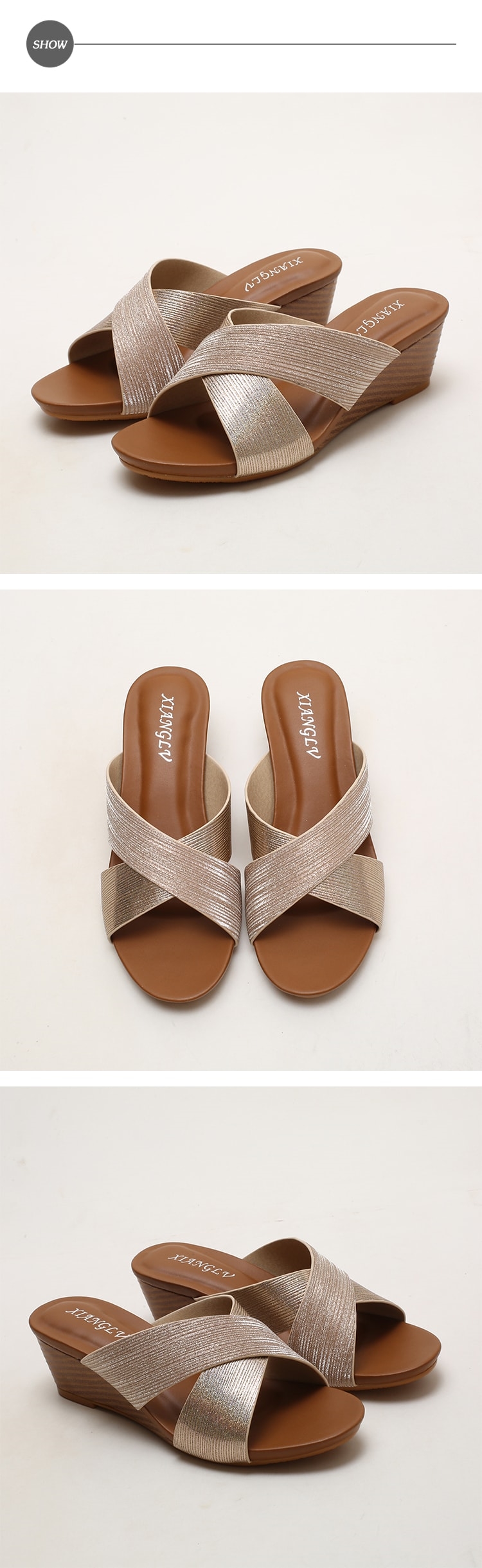 【DROM】歐美復古亮絲面交叉坡跟拖鞋/歐美復古亮絲面交叉造型坡跟拖鞋 女鞋 金