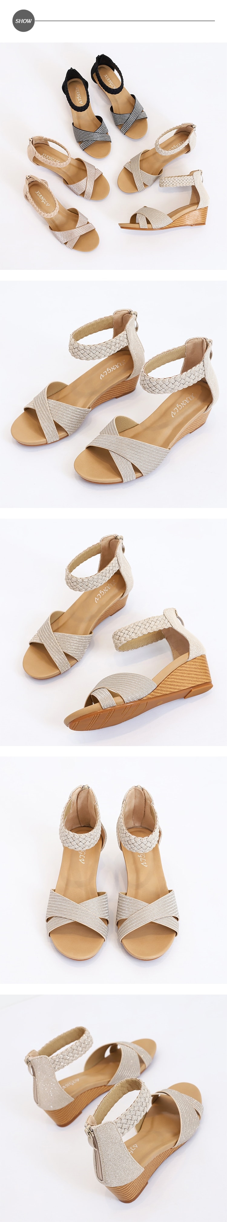 【DROM】交叉編織坡跟涼鞋/歐美時尚交叉編織繞踝造型坡跟涼鞋 女鞋 金