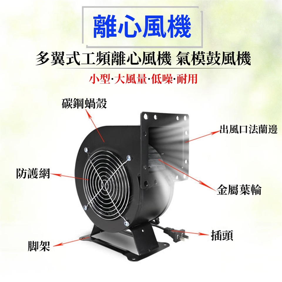 1.多翼式工頻離心風機氣模鼓風機小型●大風量●低噪●耐用,產品核心優勢,碳鋼外殼金屬風葉低噪靜音風量穩定經久耐用;