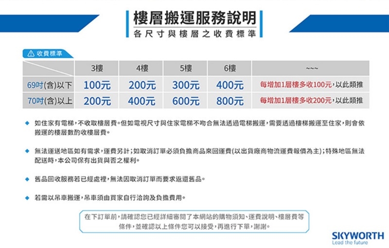 無電梯搬運上樓 樓層費用另外支付