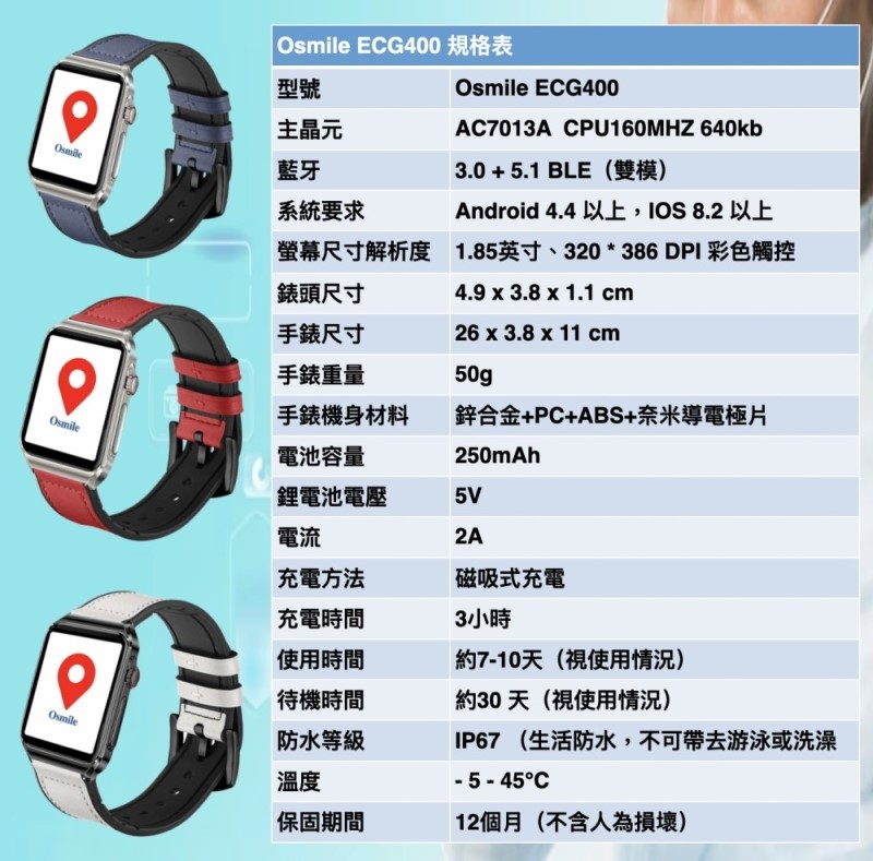 Osmile ECG400 並非醫療裝置,並非用於診斷疾病狀況。以上健康相關數據測量結果僅供參考,請勿根據 Osmile ECG400 的測量結果調整藥物。請按醫師的規定服藥,只有醫生才有資格診斷及治療疾病。所有數據僅供參考,提醒使用者平時應多加運動並注意身體健康,不應做為醫療診斷之用途,此產品並非醫療器材。