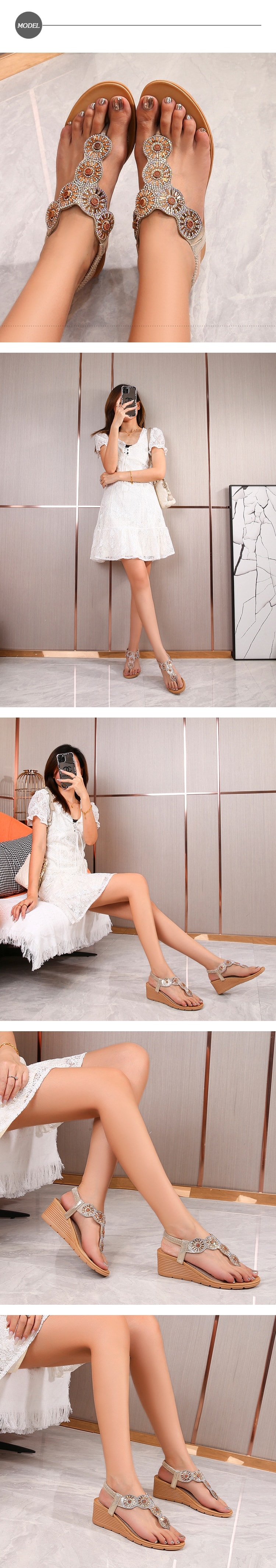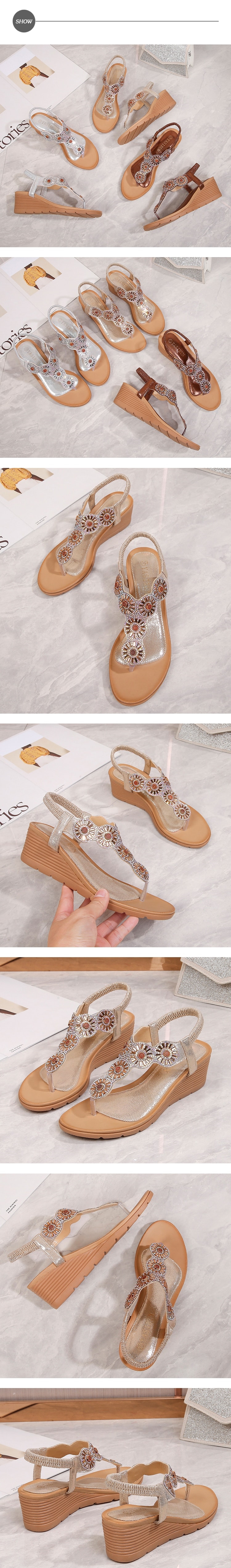 【QUEENA】美鑽太陽花朵T字坡跟涼鞋/波西米亞民族風華麗美鑽太陽花朵T字造型坡跟涼鞋 女鞋 金