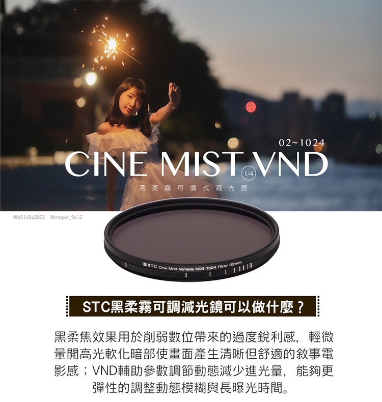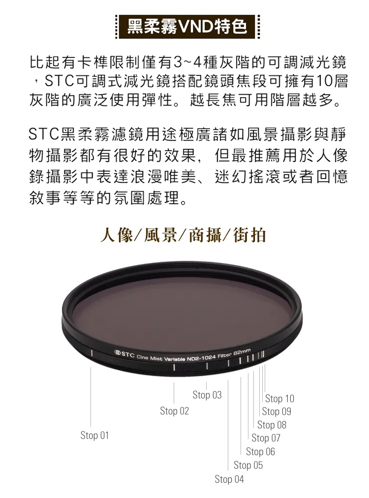 ●【品名】台灣製STC電影感1/4柔焦Cine Mist Variable黑柔霧可調減光鏡ND2-1024黑柔焦67mm濾鏡985234(雙面防污鍍膜+德國SCHOTT®玻璃)VND濾鏡