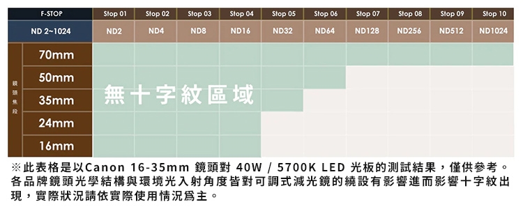各品牌鏡頭光學結構與環境光入射角度皆對可調式減光鏡的繞設有影響進而影響十字紋出現,實際狀況請依實際使用情況為主。