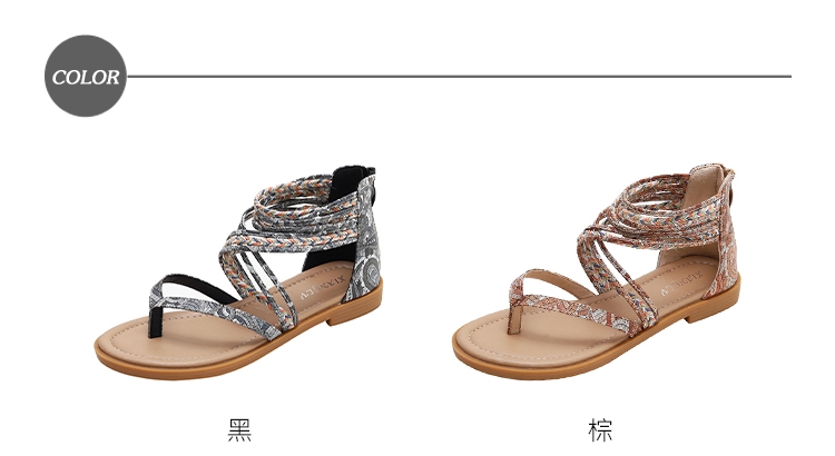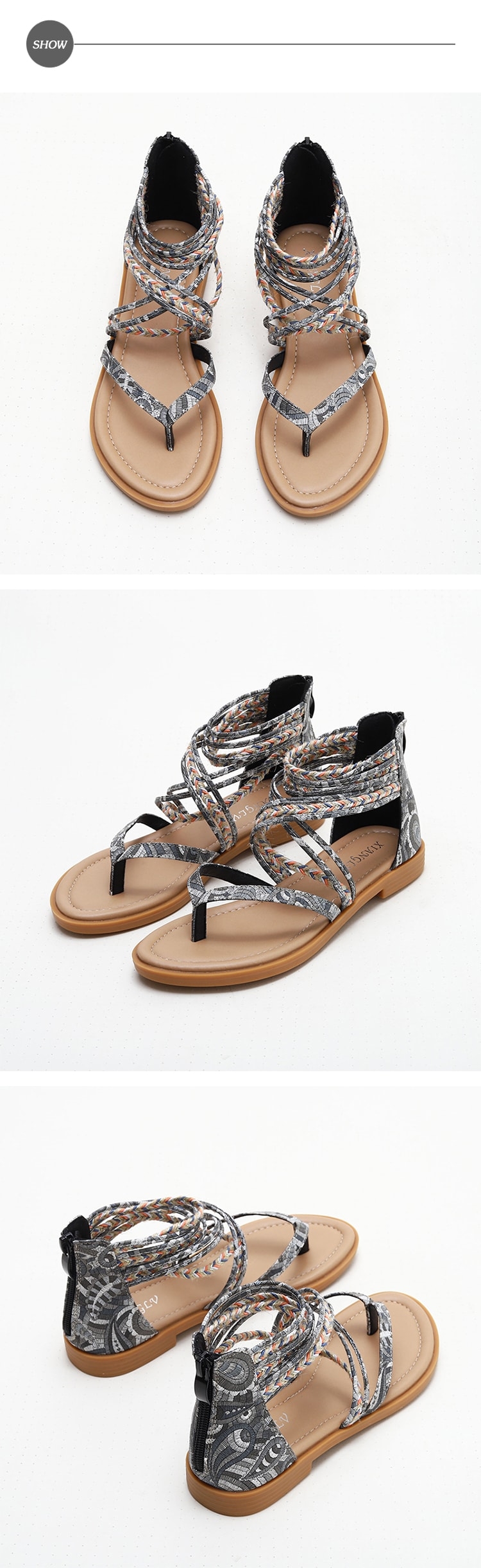 【QUEENA】圖騰印花低跟夾腳涼鞋/波西米亞民族風復古幾何圖騰印花線繩低跟夾腳涼鞋 女鞋 黑