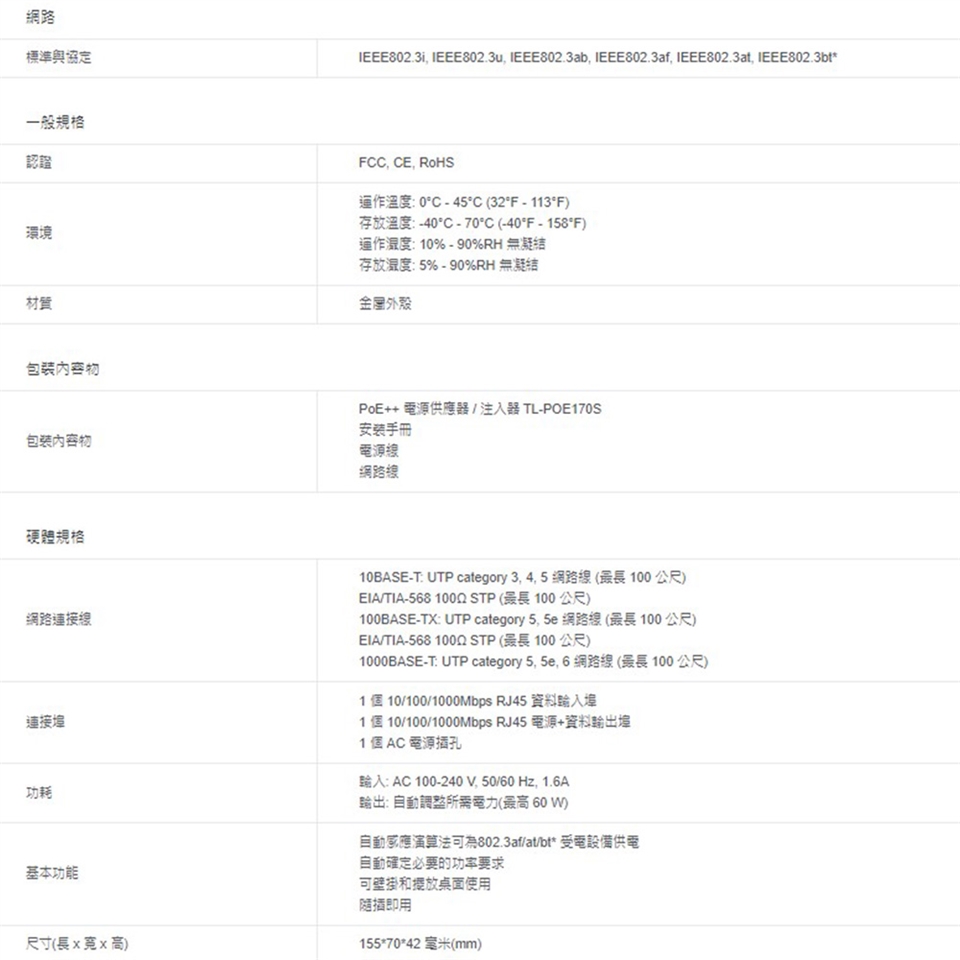 2 個 Gigabit 連接埠確保更快的傳輸 相容於 IEEE802.3af/at/bt* 標準,提供最高 60 W 透過單一網路線同時傳輸資料和電源,降低安裝成本 自動定義並供應精準的電源達到設備需求 壁掛和桌上型設計適合大多數安裝環境 隨插即用,完全無需設定 整合的電源供應 耐用的金屬機殼 |