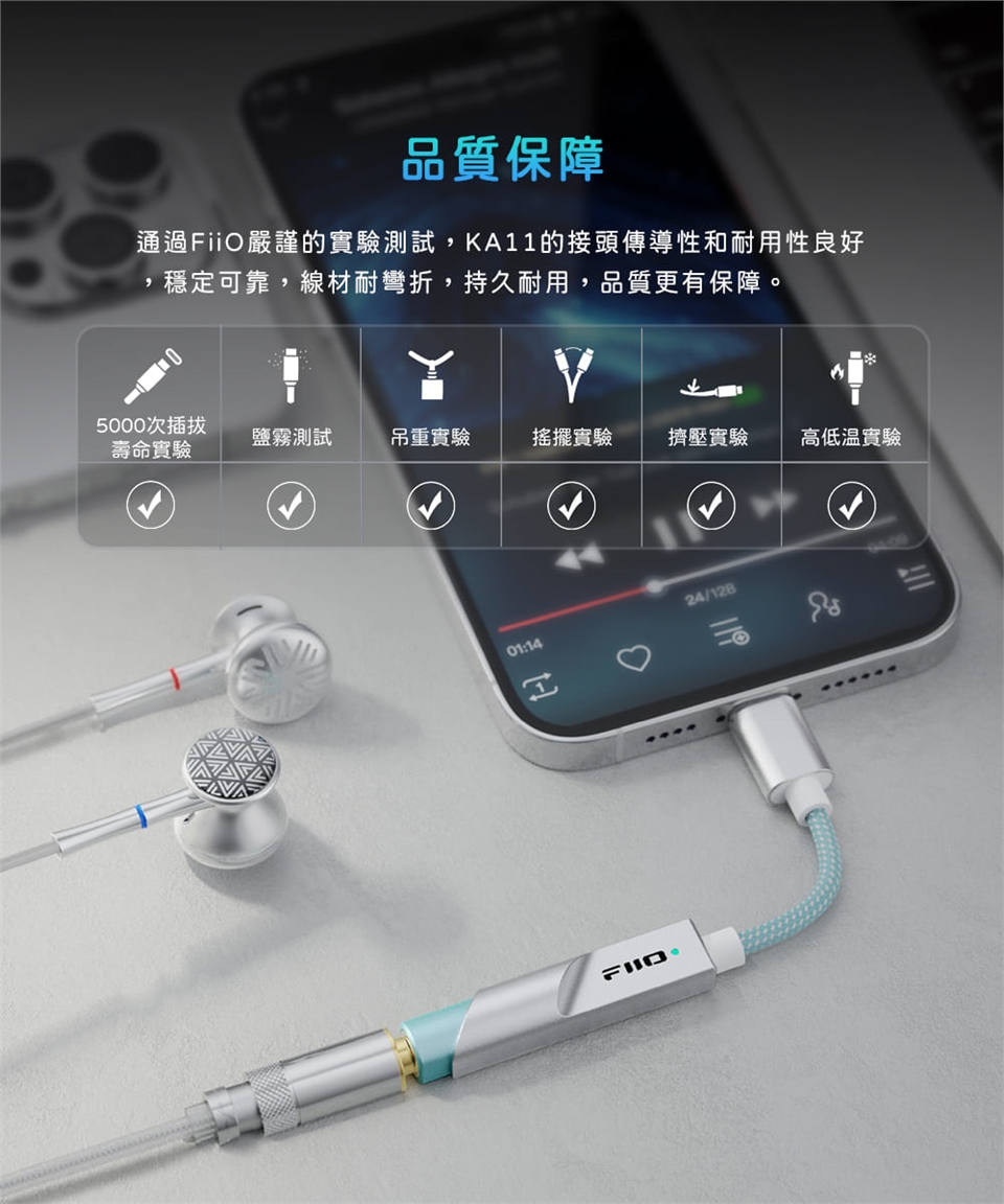 品質保障| 通過FiiO嚴謹的實驗測試,KA11的接頭傳導性和耐用性良好,穩定可靠,線材耐彎折,持久耐用,品質更有保障。