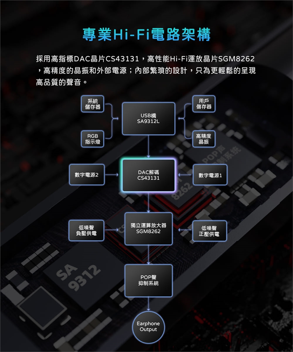 專業Hi-Fi電路架構| 高指標的DAC晶片CS43131,高性能的Hi-Fi運放晶片SGM8262,高精度的晶振和外部電源;內部繁瑣的設計,只為更輕鬆的呈現高品質的聲音。