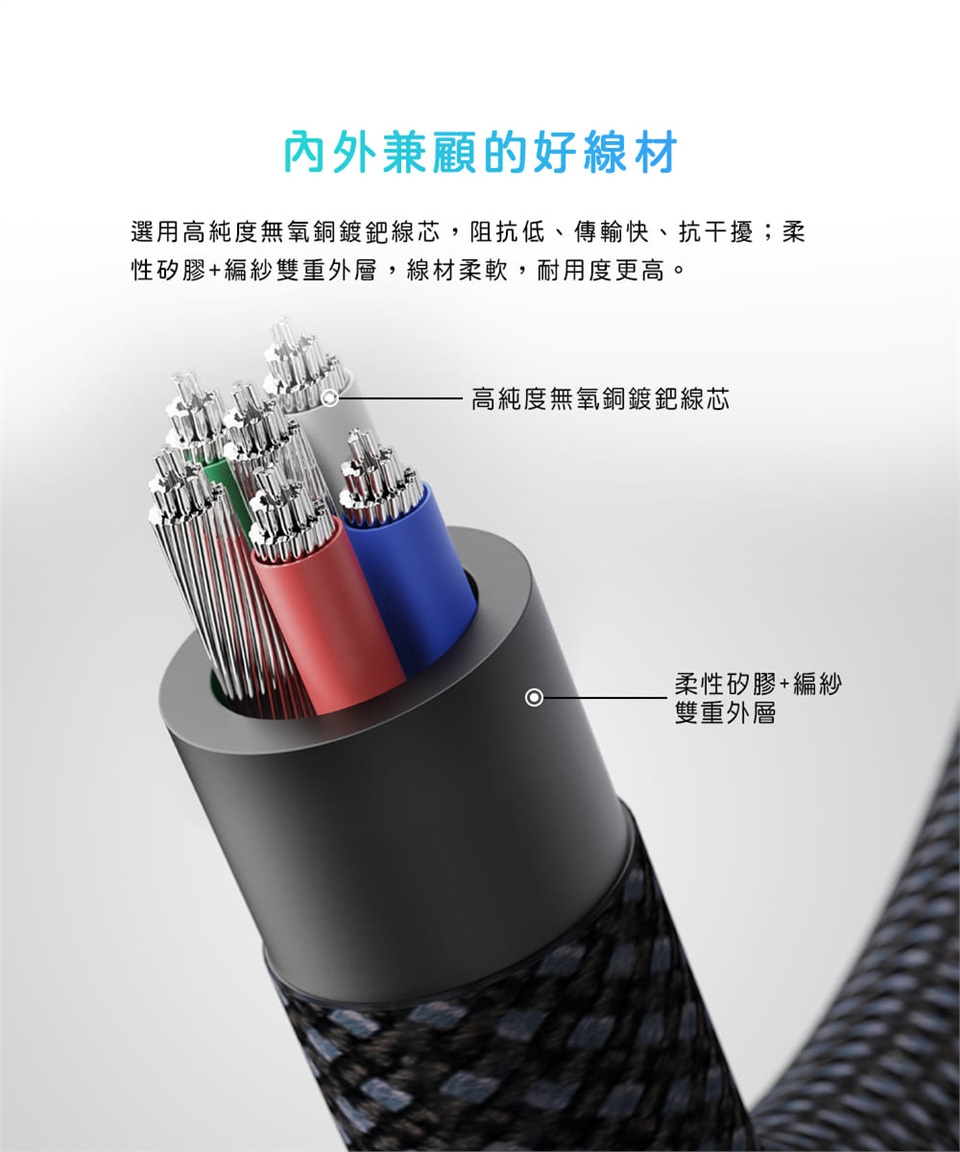 內外兼顧的好線材| 選用高純度無氧銅鍍鈀線芯,阻抗低、傳輸快、抗干擾;柔性矽膠+編紗雙重外層,線材柔軟,耐用度更高。