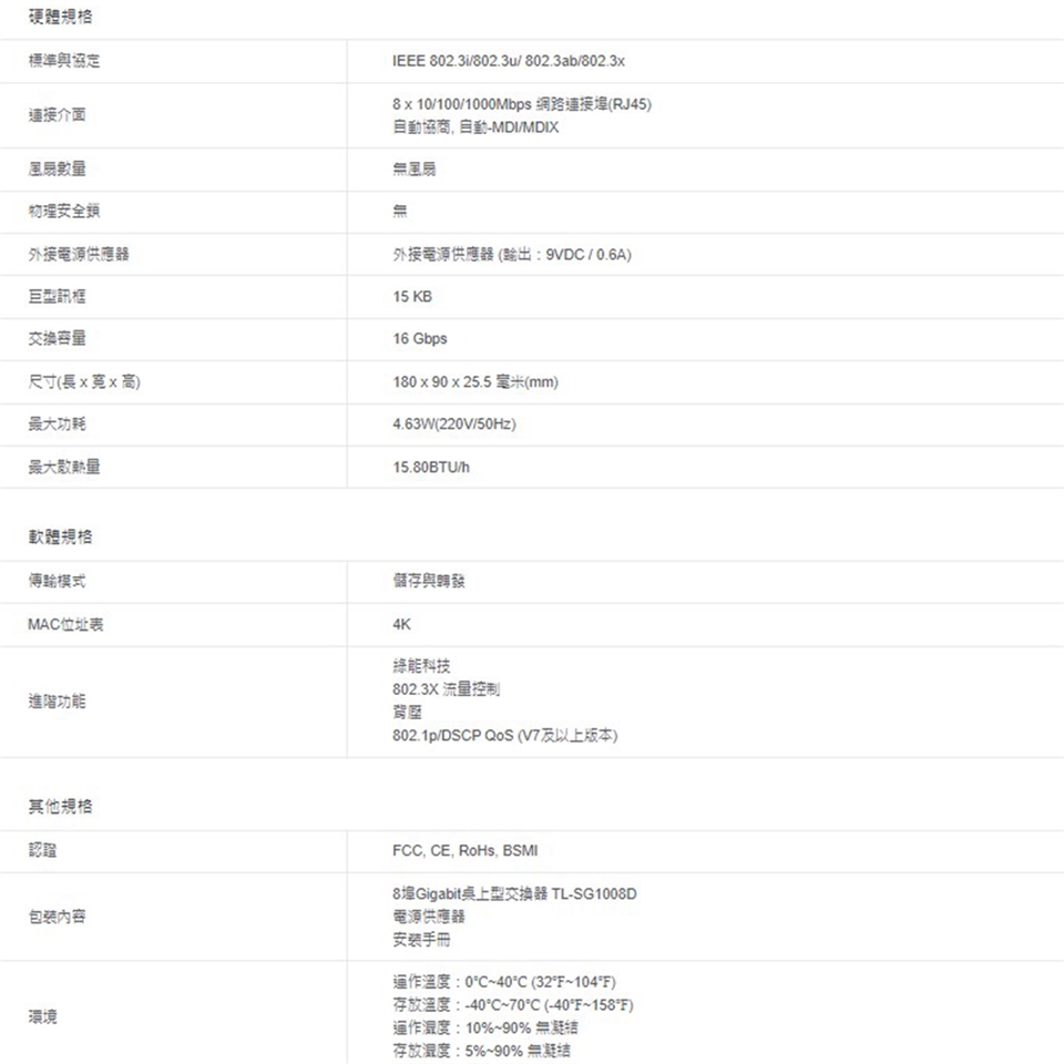 8 個 Gigabit 自動協商 RJ45 連接埠,支援自動 MDI / MDIX。