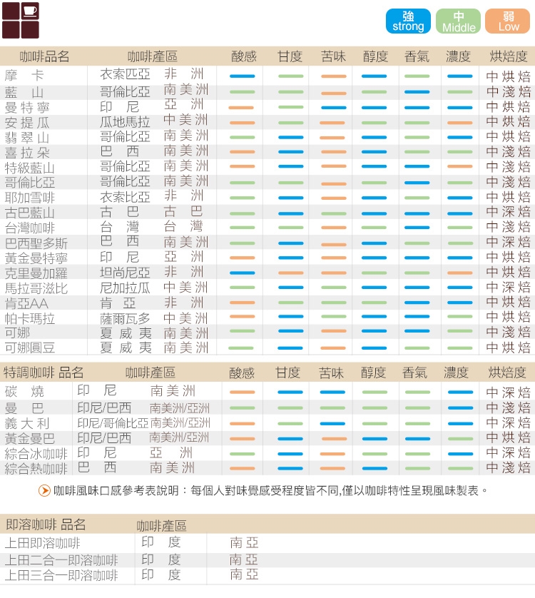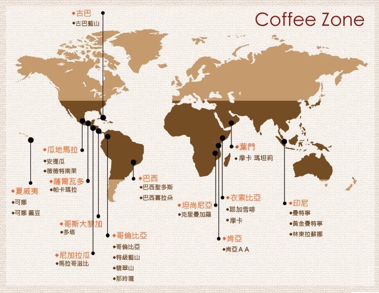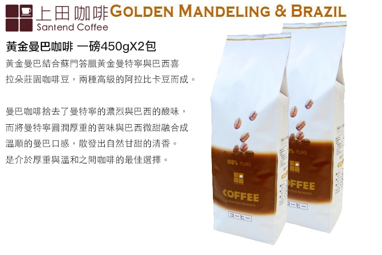 南美洲巴西喜拉朵精選咖啡豆,栽種環境在海拔1000公尺左右,全年平均溫度才20度上下,土質屬礫石層,類似葡萄莊園的土質,有利於排水與保持養分,由於乾溼季分明,加上舒適的低溫,在咖啡豆形成時具有獨特的酸性風味。 黃金曼特寧泛指蘇門達臘產區精緻栽培與加工的曼特寧,依莊園不同,香氣亦有所差異。在製程上,完全手工摘取,經過半水洗日晒乾燥後,再經四次人工篩選,古典獨特的強烈口感與高濃度的厚郁香氣,品質堪稱世界之最,一度被專家認為是世界上最好的咖啡。它有濃厚的口感以及像酒一般的醇度,並帶有濃烈野香,風味低沈老練,只有一點點酸性,餘韻深入喉嚨久久不去。