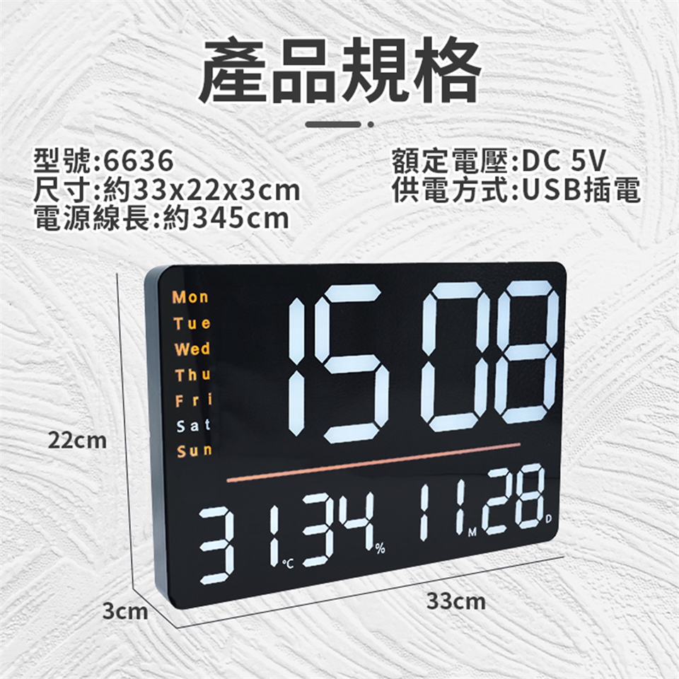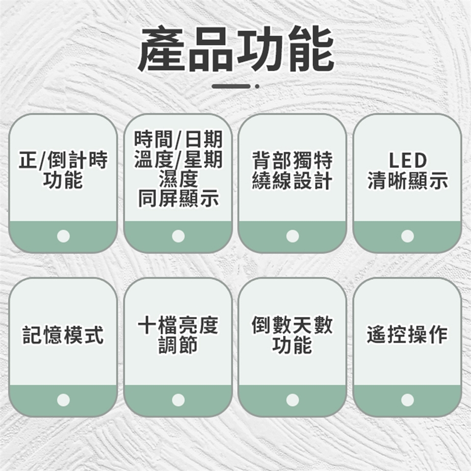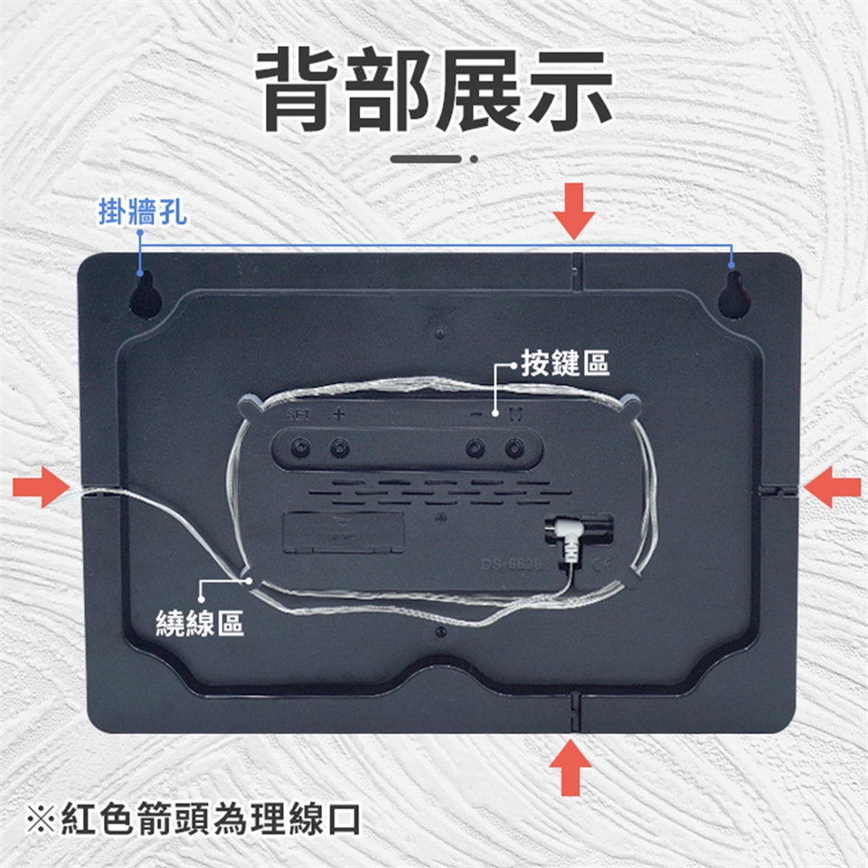 內容物:時鐘*1、電源線*1、遙控器*1、壁掛釘*2、說明書*1